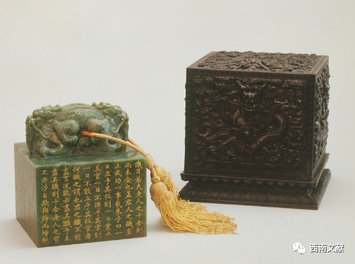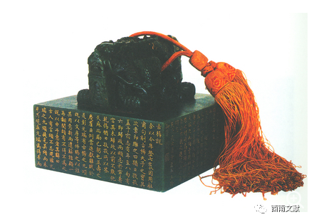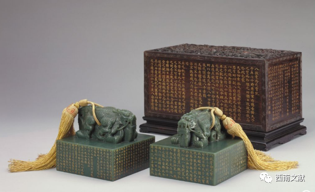 内府藏书及刊刻书籍中往往钤有历代帝王各种藏书印记,又称“印鉴”。自秦始, 天子之印曰玺。清制,皇帝之印称玺,亦曰宝,故概称为鉴藏宝玺。虽然和代表国家权力的二十五宝玺有别,但亦概称宝玺。清内府书籍中的帝王印鉴每钤于卷首、卷末的正中,或御制序文之后、前后副叶以及折装书籍的中折等处,包括珍藏、鉴赏、珍秘、审定、楼阁、斋、堂、室、轩和各种励志抒怀的闲文及肖形印等,可归为名号印、斋号印、印押和诗文印四类。它们的形制、质地、篆法均无定规,全部随皇帝之所好而刻制。清内府的印鉴以乾隆朝印文内容最为丰富。其中较有价值的是诗文印。其印文,有的是成语,有的摘自古诗文。如“古希天子”,采自杜甫《曲江》“人生七十古来稀”句。而“十全老人”、“八徵耄念之宝”、“五福五代堂古稀天子宝”等印都体现了皇帝的某种意向和情趣。同样内容的印文,可因尺寸、印文字体、形状及大小不同,而各成数方,以篆体为主,篆法多样,形状各异。《钦定古今图书集成》首叶正面钤“重华宫宝”,反面钤“五福五代堂古稀天子宝”,均为13厘米见方;文渊阁《四库全书》每卷首叶钤“文渊阁宝", 12.7厘米见方,末叶用“乾隆御览之宝”椭圆朱文印。玺印全部以上等印泥钤盖,虽年代久远,仍光艳如新,展卷之时,方整端庄,与精良的纸墨相互映衬,更增其古香可挹之感。![]()