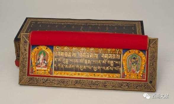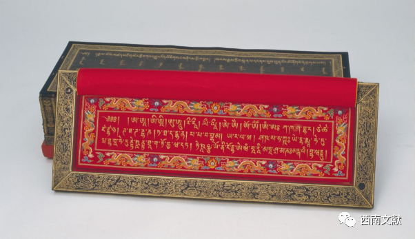 将上述各项特点集于一身的,也不乏其例。比如,清乾隆三十五年内府泥金藏文精写本《甘珠尔》即为其中的极品。此巨帙系专为庆祝乾隆帝的生母圣母皇太后八旬万寿而特制,共108夹(函),每夹200450余叶不等,为梵夹装式。经叶以磁青纸双面书写,栏线外有泥金八宝缠枝莲纹饰,细如毫发,极为精致。经叶排列以藏文字母为序, 按次叠放后,四周的泥金八宝图案立现,构思颇具匠心。在经叶之外,有内、外护经版各一对,中裹黄缎金龙夹袱和黄布单袱各一 块。外经板表面绘有泥金纹饰,里面凹进, 有彩绘佛像冠以錾金欢门和八宝等纹样, 上嵌珍珠、珊瑚珠以及蓝、绿松石共130余颗,再覆盖红、蓝、黄、绿、白五色缂丝夹帘各一。外经板之外,用宽3.5厘米、长约25米的五色扁形丝带逐圈捆缚严整,最后配挂白哈达一条。这是在梵夹装的基础上演化而成的古代佛经最后的装帧形式。层层开解时,自会从舒缓、从容的节奏中,生发出肃穆、庄严之感。《甘珠尔》集皇家材质之精华,仅珠宝就用了14000余颗。用料之考究,写绘之精细,装潢之华美,均无与伦比。整体设计豪华富丽,庄重典雅,充分显示出宗教典籍的尊贵和内府书籍雍容大方的气派,具有极高的艺术欣赏价值。![]()