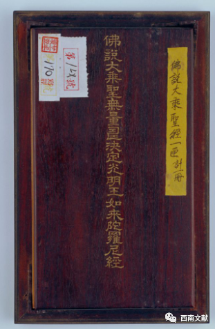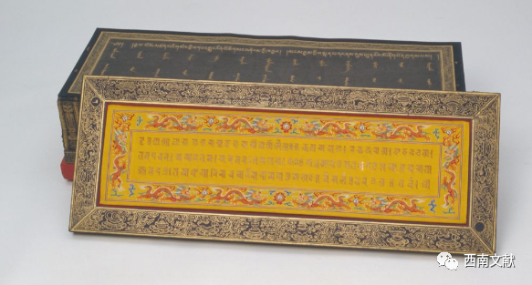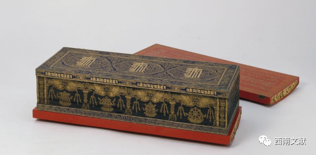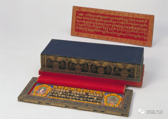 盛装佛经的书匣的制作更为复杂、精细,所采用的工艺和装饰手法有錾、雕、累丝、镶嵌、镀金、雕漆、填漆、描金等等。如清四体文泥金书《大乘无量寿决定光明如来陀罗尼经》,装在檀香木雕镶嵌书盒内。清四体文泥金写本《文殊师利菩萨赞佛法身体》,装在鎏金掐丝镶嵌书盒中,构成精细纤巧和豪华富丽的装饰效果,具有浓厚的藏传佛教艺术的特色,令人叹为观止。![]()