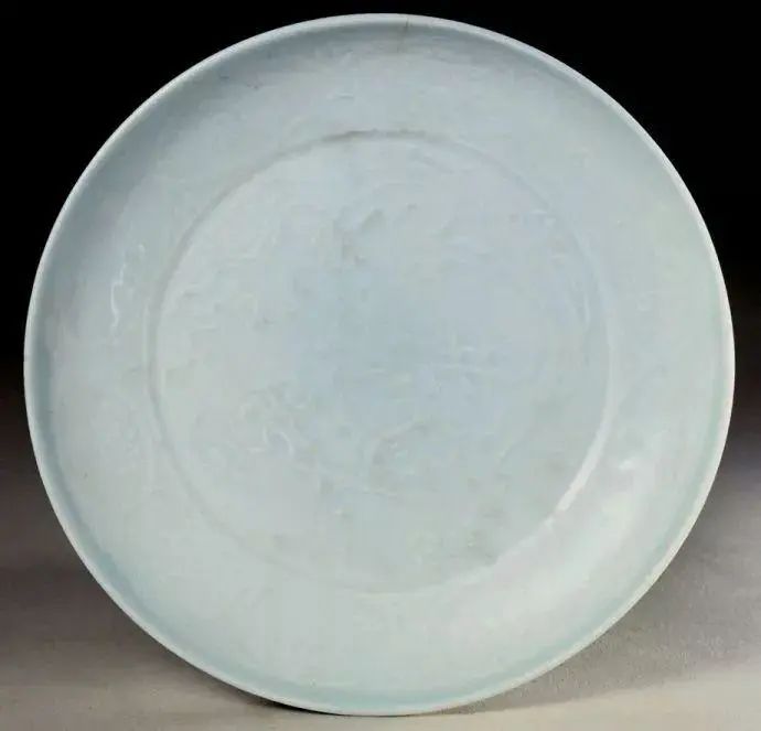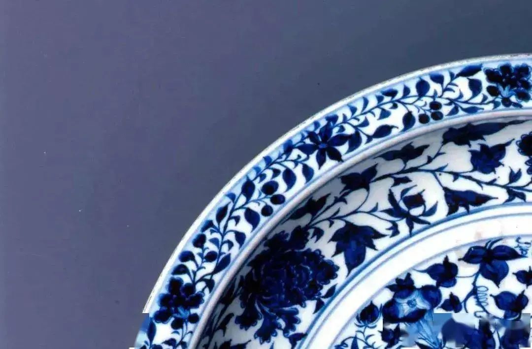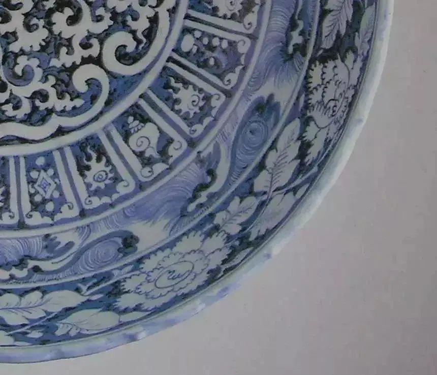 托普卡帕皇宫收藏的这件蓝釉反白大盘极为独特,工匠在制作完成后,在整个纹饰上喷洒了一层斑驳细密的色点。这种装饰手法未见于世界其他元青花藏品。