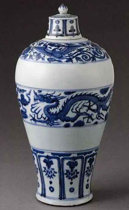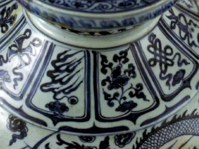 青花:青花是用钴料在白色坯胎上绘纹饰后罩透明釉,在还原气氛中经高温一次烧出的白地蓝花瓷器。不罩釉烧出来的纹饿是黑色的。元代中、晚期青花瓷器、大致可分为为两大类:一类多为小件器物,胎子轻薄,不甚精细,多为青白、乳白半透明或影青釉,青花的颜色灰暗迷蒙,纹饰稀疏但奔放洒脱,有的可以说相当潦草,所有钴料含锰量高含铁量低,和国产的钴土矿特点相同,应是国产钴料所绘,常见器物有高中产杯、碗、盘、匜、香炉、小罐、蒜头瓶、玉壶春瓶等,多为日常生活用品,这类青花瓷器当时生产数量有限,属民用瓷;还有一类青花瓷器,以大件器物为多,其共同特点是大器者胎体厚重,小件轻薄,色白致密,透明釉白中闪青,青花颜色浓艳鲜亮,色浓处有黑褐色斑点,纹饰层次多,有的甚至多达十来层,来得很满期,但繁而不乱,层与层之间留一周空白,器底端两层之间无空白,每层纹饰内容之间没什么关系,如经常是在缠枝菊、蕉叶、缠枝莲、缠枝牡丹之间夹杂云凤、云龙、杂宝、海水江牙等,将毫不相干的纹饰组合在一件器物上。