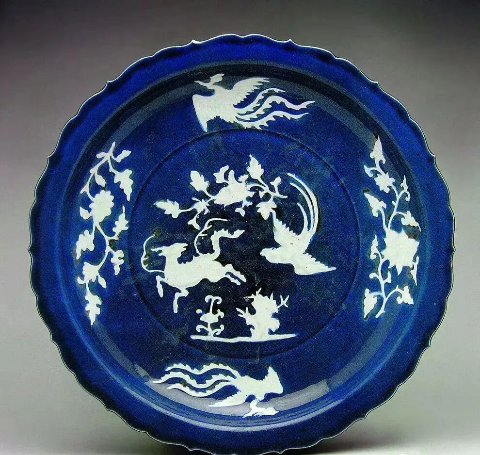 麒麟飞凤蓝釉白花菱口大盘