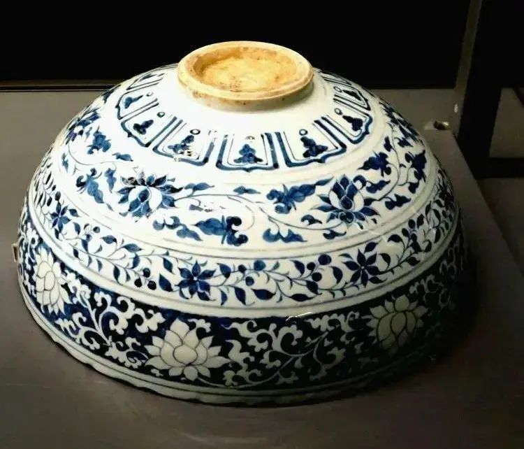 这是托普卡帕宫收藏的体形最大的一只青花碗,其尺寸是超群的,在全世界都极为罕见。这只碗的碗心绘有一朵翘枝莲花,四周环绕白云锦文、海浪等。外壁绘有翘枝莲花等精美纹饰,青花及留白交相辉映。