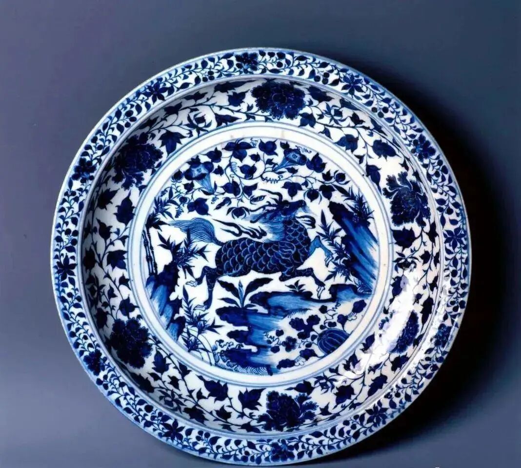 蓝釉作地,反衬白色纹饰的元代青花大盘,盘面上绘有中国传统文化中常见的麒麟和飞凤。周边围绕着花样繁复的花卉。釉面肥润而细腻,蓝色饱满,吐露着神秘的气息。这样的大盘在世界上独一无二。