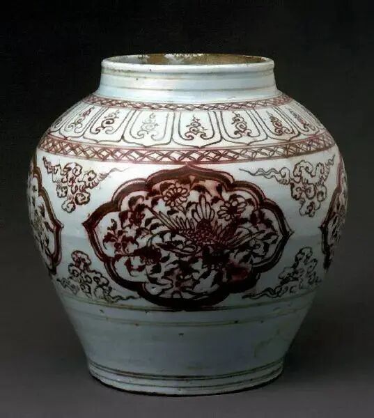 釉里红:釉里红是用氧化铜在坯胎上绘画纹饰后罩透明釉,在还原气氛中一次高温烧出的白地红花瓷器。于花和釉里红除了所有绘画原料不同、成品效果不同以外,其制做技术、绘画方法和烧制工艺基本相同。只是釉里红的烧成气氛比青花的更严格,更不好掌握,元代釉里红瓷与元青花瓷一样,具有胎子细密、坚致、洁白,釉子白中闪青,非常光润的特点。纹饰多见缠枝菊、牡丹、莲花、云龙、云凤、云鹤、孔雀、芦雁、人物故事等,边饰多为变体莲瓣、云肩、灵芝云、蕉叶、回纹、弦纹等。器型多为大罐、高足杯、匜、玉壶春瓶、塔式罐、谷仓、大盘、碗、瓷雕人物等等。