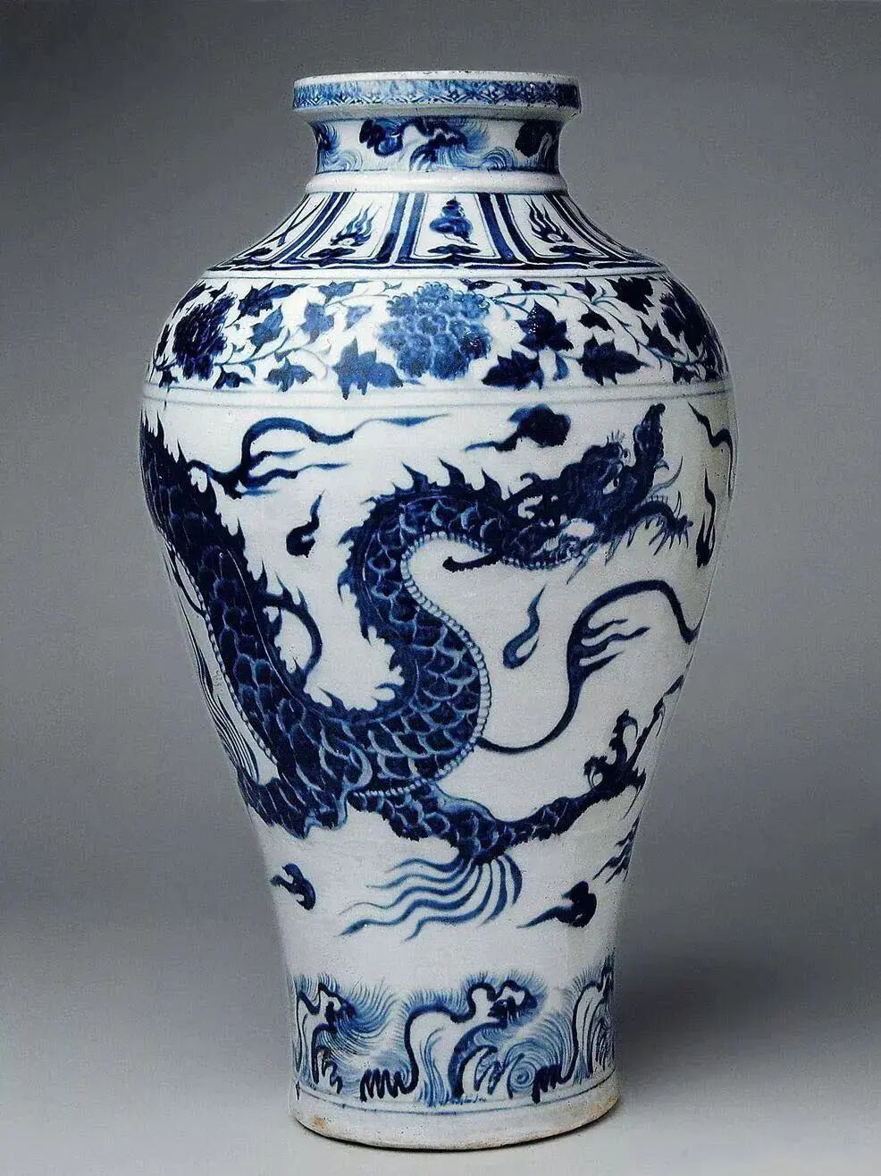 这只龙纹瓶身上通体绘有一条青龙,体型大,从单一角度只能“见首不见尾”或“见尾不见首”。