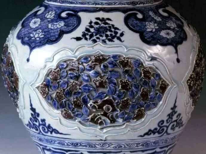 蓝釉瓷:蓝釉瓷是元代景德镇创烧的新品种。它是以钴蓝为着色剂,经高温一次烧成的。元代昨釉瓷有光素无纹,有的饰有刻白纹饰,有的加绘金彩。