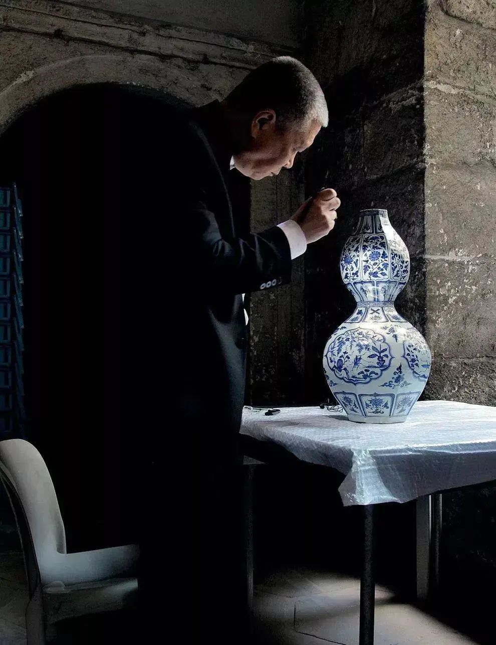 马未都在仔细研究托普卡帕中的一件八方葫芦瓶
