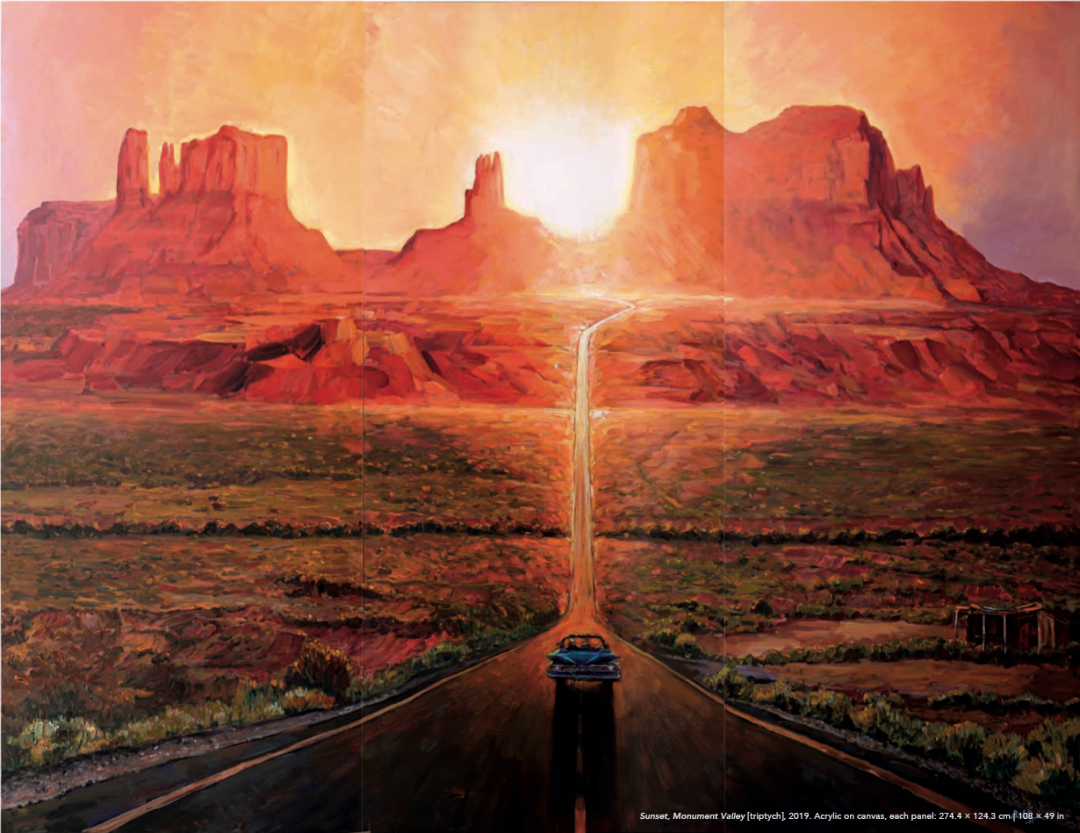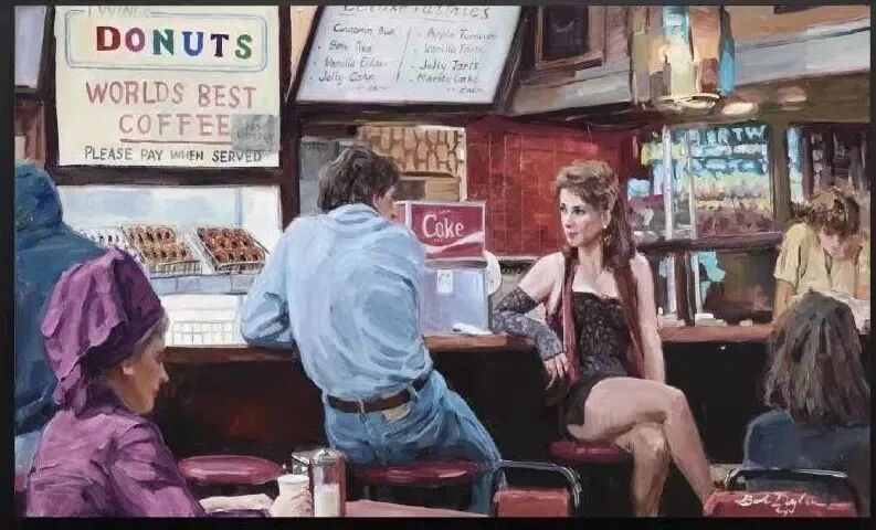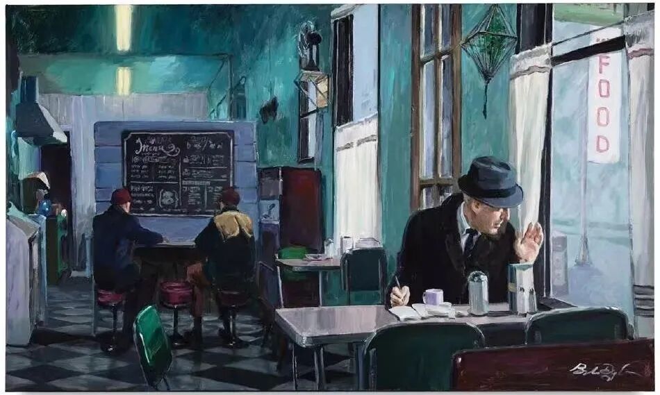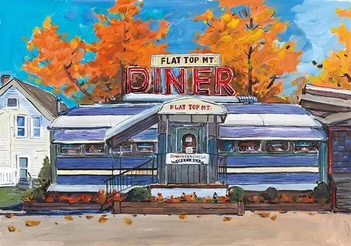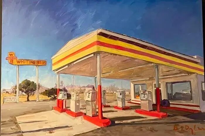 而为了还原他眼中的世界,迪伦还会借助摄影中的暗箱技术来辅助绘画。暗箱相机是17世纪发明的一种原始相机,它能将图像倒立投影,然后画家可以根据其中的轮廓去填充色彩。《Topanga Ranch汽车旅馆》、《冰淇淋工厂》、《卡车停靠站》、《平顶餐馆》、《墨西哥餐厅》等画作都是通过这种方式创作的。