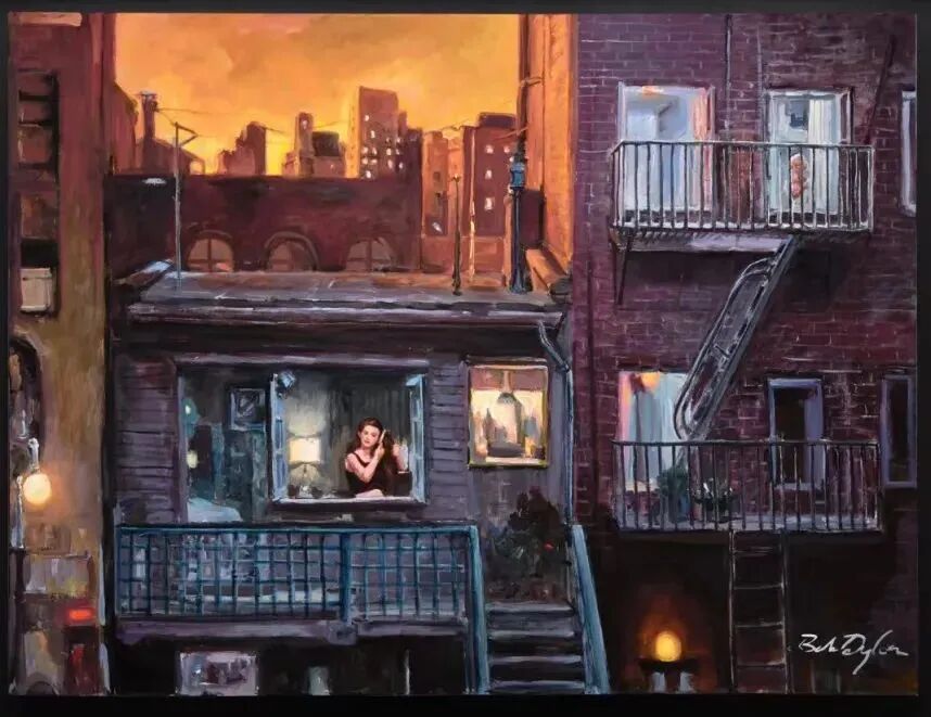 迪伦喜欢描绘他所看到的世界。高楼大厦占据着城市的天空,迪伦选择视而不见,修剪得整整齐齐的高尔夫球场在他眼里还不如林间无人问津的小房子。他独特的视角使得他的画看起来与现代社会格格不入。