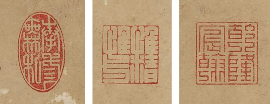 本幅收录于《石渠宝笈初编》,经乾隆及嘉庆鉴赏,上有钤有「乾隆御览之宝」、「石渠宝笈」、「养心殿鉴藏宝」三玺及「嘉庆御览之宝」。在画作右下方另有「乐善堂图书记」印,乐善堂仍乾隆年轻时之书房,初设在圆明园桃花坞中,后雍正即位,乾隆随父皇迁居紫禁城内的西二所,当中第一重殿崇敬殿内,即为弘历读书写作之处「乐善堂」,此意味着,本作品完成后,很早便收到乾隆手中,亦为聂崇正先生推论之佐证。