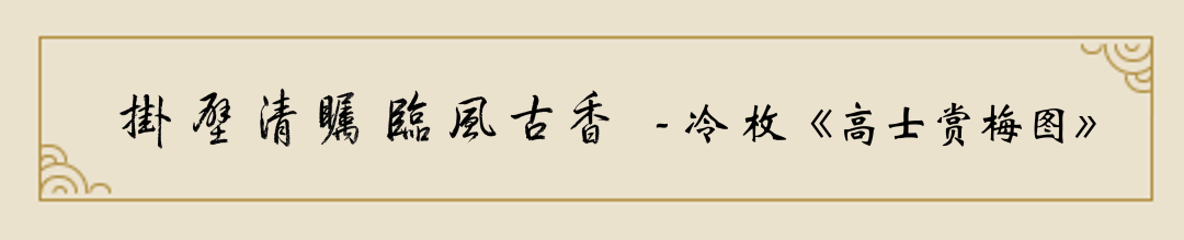 本幅作品纪年「癸巳」,仍康熙五十二年(1713),同年为冷枚再次被召入宫中领衔绘制《康熙万寿图》之时,仍他艺术生涯上的巅峰期。本作品以一曲折灵动的梅树作背景,树下有一红衣高士,在童子开伞挡雪下,寻找梅花一枝,表达手法简洁清晰。人物开脸保留传统「三白法」分染,再施以明暗渲染,塑造出立体感,用笔轻且松,带有温婉雅淡之效果。所绘之高士,虽未有文字指向,但如斯部局,已给乾隆足够的幻想空间。
