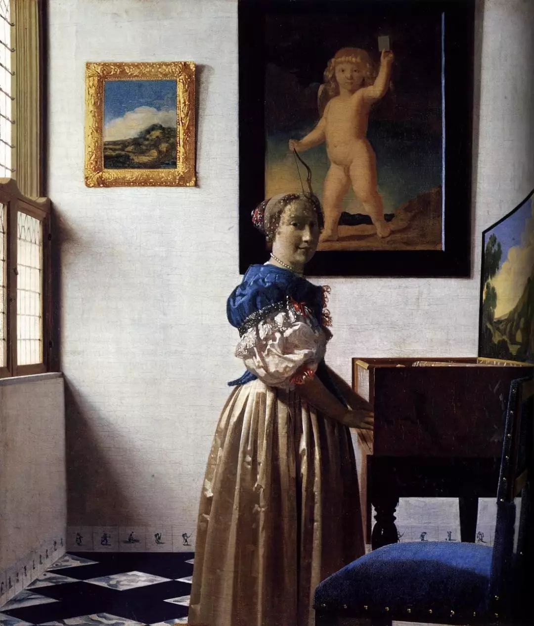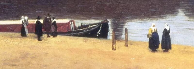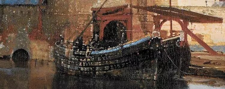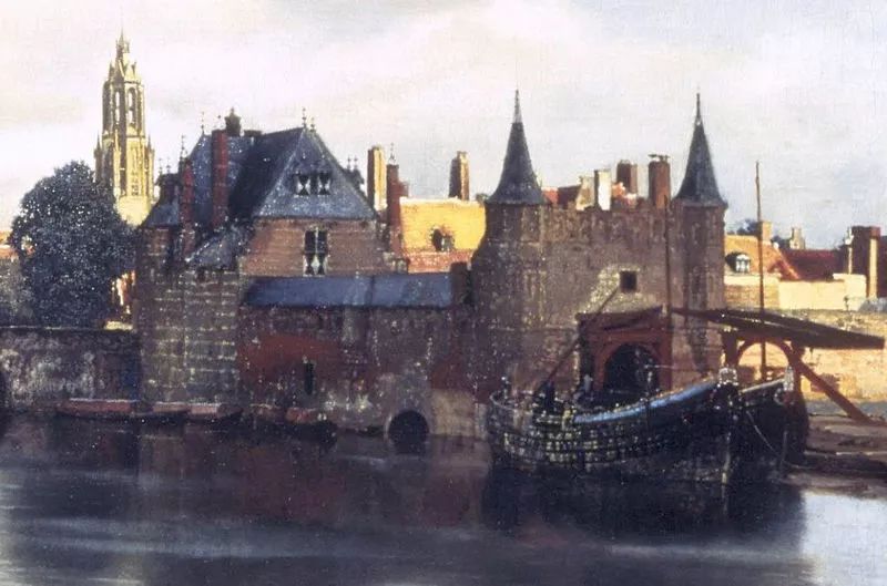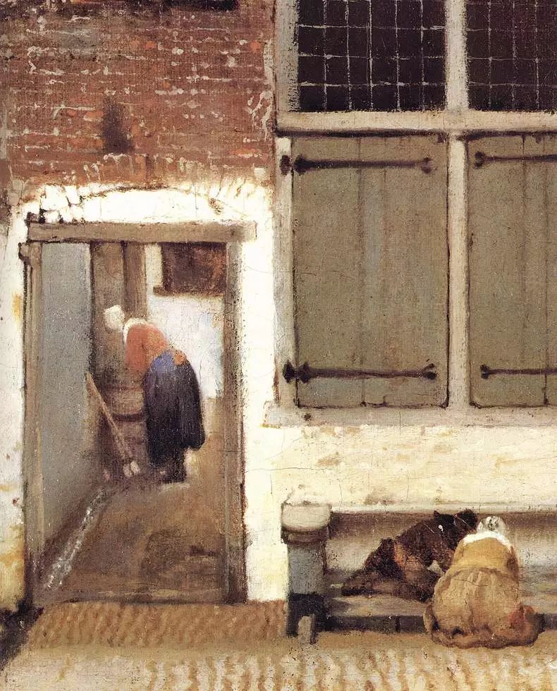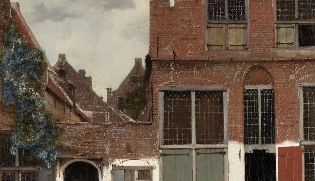 《戴珍珠耳环的少女》是荷兰黄金时代巨匠维米尔的代表作,是一幅小小的油画,比8开纸大不了多少。油彩都已经干得开裂,但就是这样一幅看似不起眼的小画,却使得许多艺术爱好者、游人看客在画前欲走不能,是什么在震撼他们的心灵?画中少女的惊鸿一瞥仿佛摄取了观画者的灵魂,维米尔在这幅画中采用了全黑的背景,从而取得了相当强的三维效果。黑色的背景烘托出少女形象的魅力,使她犹如黑暗中的一盏明灯,光彩夺目。画中的少女侧着身,转头向我们凝望,双唇微微开启,仿佛要诉说什么,她闪烁的目光流露殷切之情,头稍稍向左倾侧,仿佛迷失在万千思绪之中。少女身穿一件朴实无华的棕色外衣,白色的衣领、蓝色的头巾和垂下的柠檬色头巾布,形成鲜明的色彩对比。维梅尔在画中使用平凡、单纯的色彩和有限的色调范围,然后用清漆取得层次和阴影的效果,这幅画另一个瞩目之处,是少女左耳佩戴的一只泪滴形珍珠耳环,在少女颈部的阴影里似隐似现,是整幅画的点睛之笔。珍珠在维梅尔的画中通常是贞洁的象征,有评论家认为这幅画很可能作于少女成婚前夕。画中少女的气质超凡出尘,她心无旁骛地凝视着画家,也凝视着我们。欣赏这幅画时,观者会很轻易地融化在这脉脉的凝望中,物我两忘。荷兰艺术评论家戈施耶德认为维米尔最出色的作品是“北方的蒙娜丽莎 ”。Gemldegalerie Alte Meister, Dresden, Germany描绘一个所谓的“牟利之爱”(mercenary love)的场面,亦可称为卖淫活动,这大概是维米尔最淫秽的画作。事实上,妓女拉客的画面远远超出了维米尔的行为准则范围,以至于许多人怀疑他是否真正画了这幅作品。尽管学者们都怀疑位于画面左侧远处的乐师可能是维米尔的自画像。这幅画还有维米尔的签名,但画作缺失了艺术家标志性处理光线的精巧度:4位人物中有3位大面积地处于黑暗之中,而那位妓女则沐浴于强烈而明亮的光照之中,光线油滑地照亮着她那过于红润的面颊。有些人也许会说,这种非维米尔特色的光线处理是画家刻意为之,就像史学家 Edward Snow所想的那样。谈到那位一半身体处于光照之中,企图占有画中妓女的男子。Snow在他的书籍《对维米尔的研究》(A Study ofVermeer)中写道:“他作为过渡性的角色而存在着:调节阴影中的其他人物与女子,并越过他同伴们所处的世界以连接明暗区域,他的面庞仍是半阴影状。”他以一种保护式的障碍而非侵入者的形象,享受着画中女子明亮的存在,并阻隔着对女子有所企图的黑暗, 然而,这幅画是最不具有维米尔特点但又广为流传的维米尔作品之一。a painting once owned by Van Ruijven在《代尔夫特风景》中,艺术家在最元素化的级别上,以化繁为简的方式极简单地展现了这幅作品的卓越性。这幅画几近朴实,为了准确展现画家家乡的天际线,维米尔大量使用了他最喜爱的光学辅助:暗箱,而画面景致中最令人忧伤的一点,则蕴藏于它自身的一些特质之中:艺术家似乎将景色中的建筑进行了轻微挪移,其中最明显的地方便在于鹿特丹大门的那一个长块,这样一来,画家笔下的整座城市便显得,不那么狭窄也因而更受欢迎。另外,站在纯绘画的层面,这幅画无疑能在一众对内部光线,进行复杂戏剧式处理的作品之中脱颖而出。以上元素汇集起来所创造的结果,便是欧洲艺术中最令人记忆深刻的城市风光,而对我们而言则是维米尔最优秀的作品。在《小巷》一画中,整个画面完全把时间凝固了,无论是在巷中洗衣的女人、坐在门前缝补的妇女,还是在路边游戏的小孩,她们原本正进行的动作在维米尔的画笔下,完全停滞下来。在这幅画前,我们的心灵得以沉淀,发出清淡的忧伤,我们在其中感受到身旁的时间正悄然地划过脚趾。第一眼看来,这幅描绘代尔夫特幽深巷道的画作十分稀松平常,它也许没有《读信的蓝衣女子》所给予我们的那种戏剧表达。事实上,《小巷》的主题正如你所能理解到的那样毫无浪漫气息:都是关于日常杂务。你必须仔细品味才能懂得这个作品一直为人称道的地方:它尽心呈现的细节。建筑细节所带来的与观者的亲密感被如此生动地呈现,关于这条巷道是真实的存在还是虚构的争论从未停止。画中的两个人物如此完美地身处于门中似乎不是巧合,这样的构图为每天的日常主题带去了一种艺术性的升华。正如Athony Balley在他关于维米尔的书中所提到的,女人们进行着她们日常劳动以维持她们的世界运转,这样描绘的图像与建筑细节结合起来,传达出一种更具大局的信息:“时间在这一刻停滞,并由此生出一种永恒之感,这似乎才是维米尔的重要主题。另外,砖墙与砂浆之上岁月的痕迹清晰可见,而那些细碎事实因为无法回答,而支撑着我们脆弱而短暂的存在,例如, ‘我们正在做什么?’”Stdelsches Kunstinstitut, Frankfurt, inv. no. 1149维米尔精心经营构图,桌子前置营造围和感小空间,物品摆放营造相对稳定的斜对角构图,从画面中可以感受到那种不过分死板的稳定感,为了追求这个感觉,色彩上他要用仅仅产于阿富汗的青金石(当时特别昂贵)碾磨的颜料去渲染画面中静谧的蓝色。从画面中可以看到在暖色调黄色光照对比下,那种隐隐淡淡的蓝色如此安静。从笔触上,如果有机会看原作,你将会看到维米尔笔触是很平顺的,这极大区别于他师祖级别,同为荷兰大师的伦勃朗那种豪放的笔触,这样的笔触,也是为了传达那种静谧的感觉。除