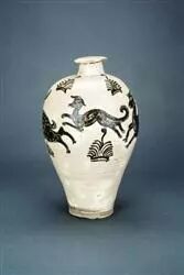 白釉黑彩梅瓶上的动物图案独特。右为褐彩梅瓶,绘有牡丹。