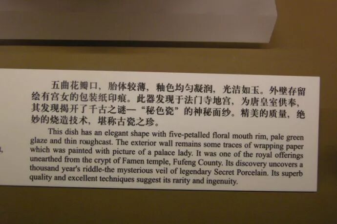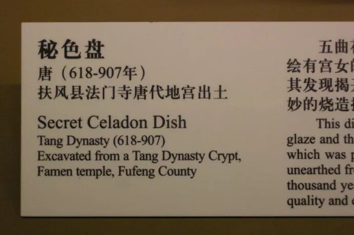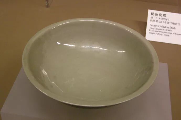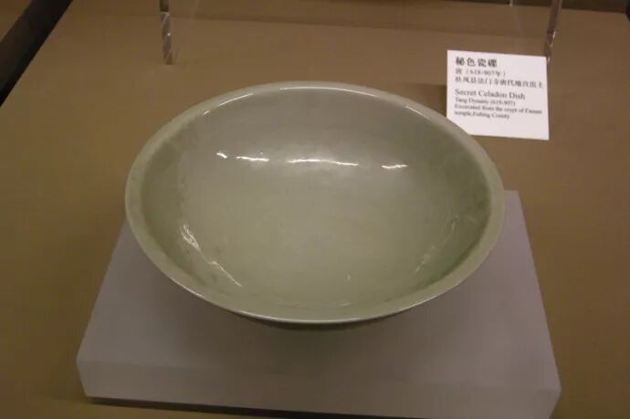 唐代"秘色瓷"造型严谨,釉色青翠均匀,色泽典雅,体现了盛唐时卓越的制瓷工艺水平。现今发现的唐代越窑"秘色瓷"都是陶瓷史上的精品。此时为越窑青瓷发展的顶峰。1987年4月,陕西省考古工作者在扶风县法门寺塔唐代地宫,发掘出13件越窑青瓷器,在记录法门寺皇室供奉器物的物帐上,这批瓷器明确记载为“瓷秘色”,从而使人们进一步认识了“秘色瓷”。