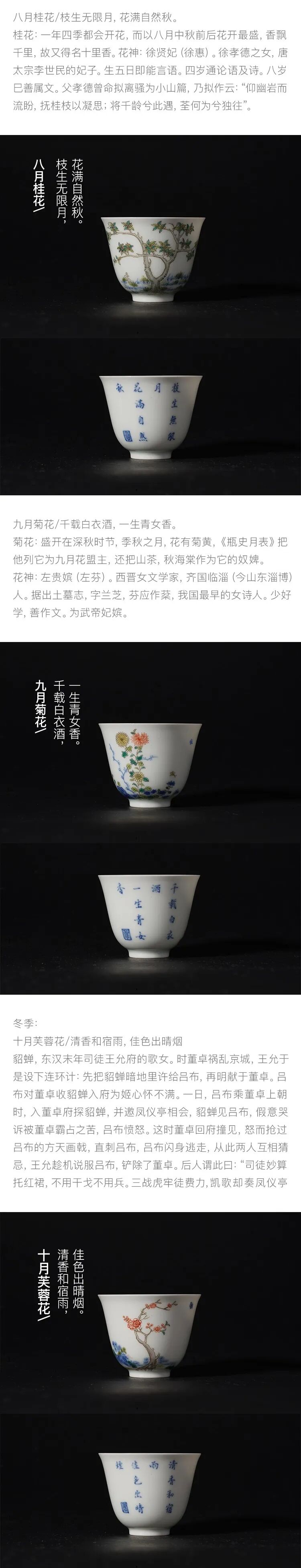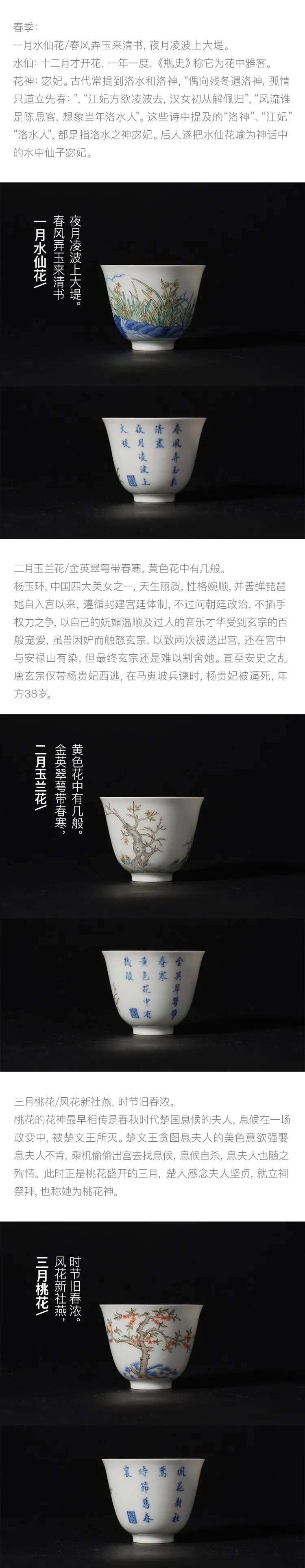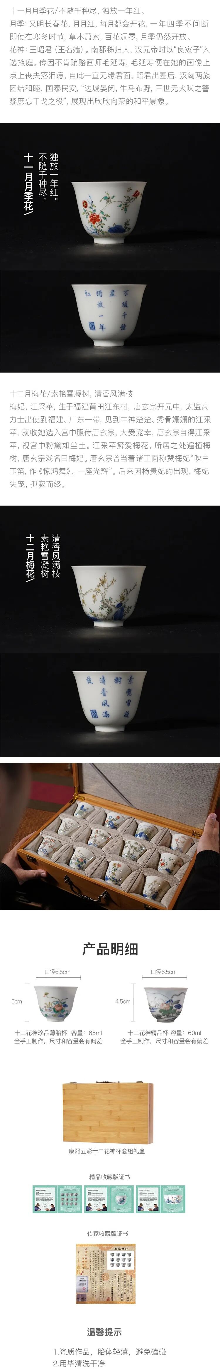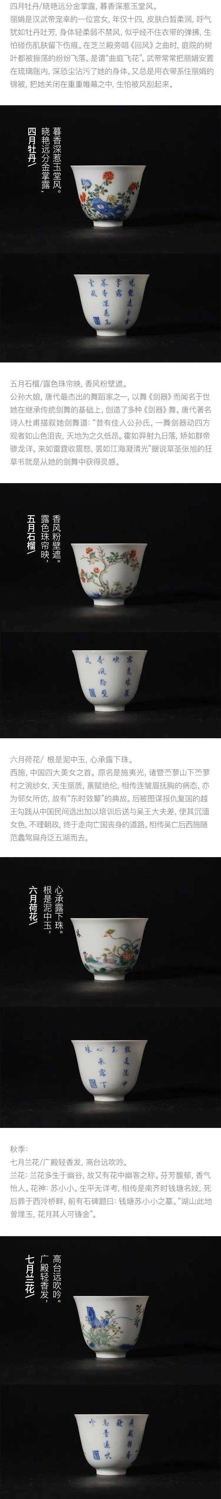 茗家私享,作为御窑厂、御窑博物院优选的文创衍生品合作品牌,团队从中国陶瓷文化博物馆研究青花十二花神杯,到大英博物馆里对较五彩十二花神杯。