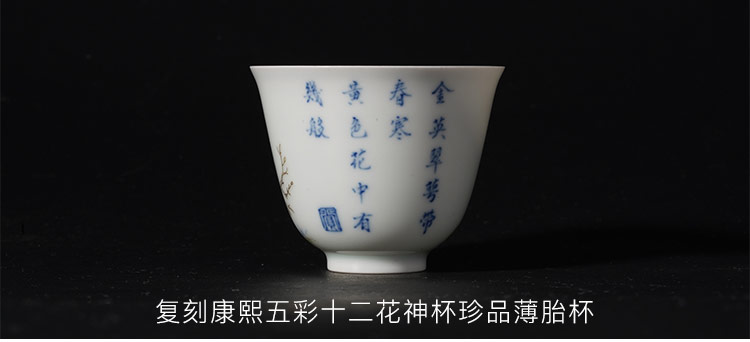景德镇御窑厂于康熙二十五年烧制的五彩十二花神杯,划时代地结合了瓷艺、诗词、书法、绘画、篆刻五种艺术于一身,富有浓郁的文人艺术气息,品味高雅脱俗。