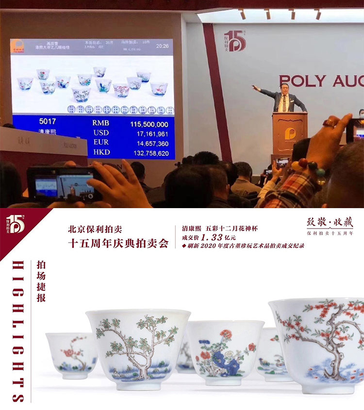 康熙专场首先举槌,领衔的一套五彩十二月花神杯,以RMB 1.15亿落槌、连佣近RMB 1.33亿天价成交,刷新2020年度古董珍玩艺术品拍卖成交纪录;为保利15周年拍卖再添一宗破亿成交以外,亦荣登本年「最贵瓷器」宝座。
