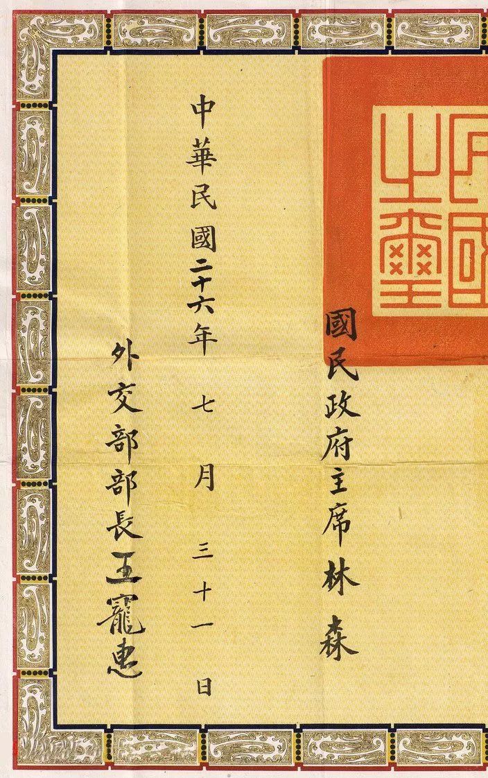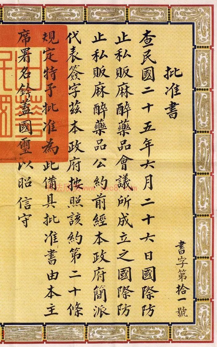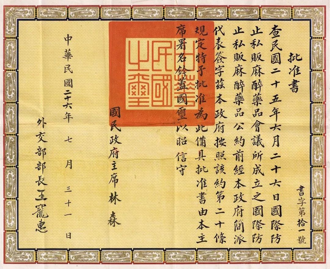 民国政府主席林森签署《批准书》,中国正式批准《禁止非法贩运危险药物公约》,中华民国二十六年七月三十一日,外交部部长王宠惠。