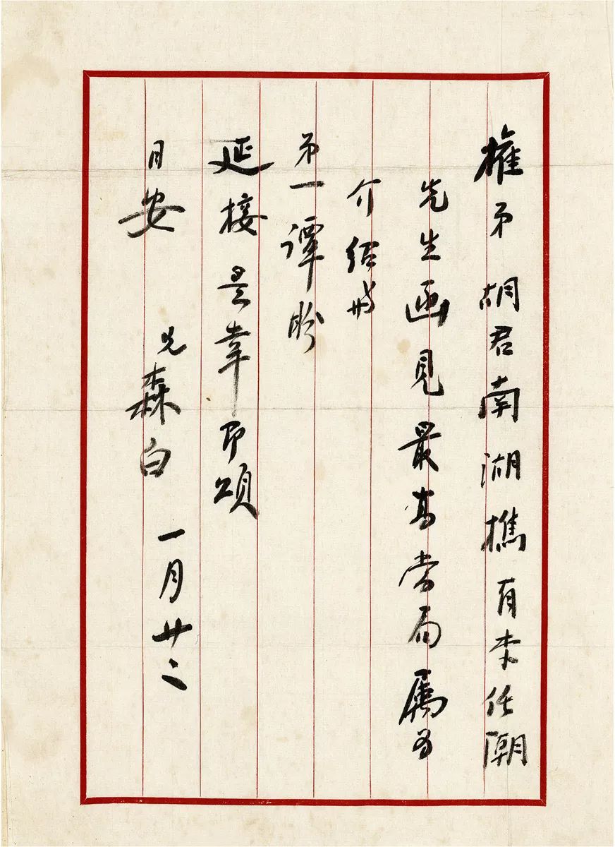 识文:权弟:胡君南湖携有李任潮先生函,见最高当局,属为介绍与弟一谭,盼延接是幸,即颂日安。兄森白。一月廿二。