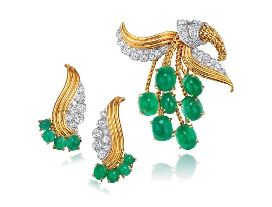 祖母绿配钻石胸针;及耳环套装,TRABERT AND HOEFFER-MAUBOUSSIN,年份约1950