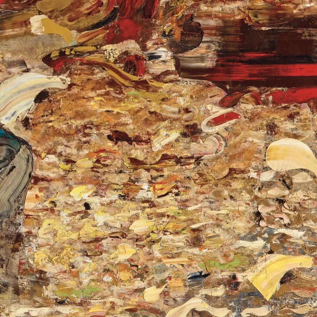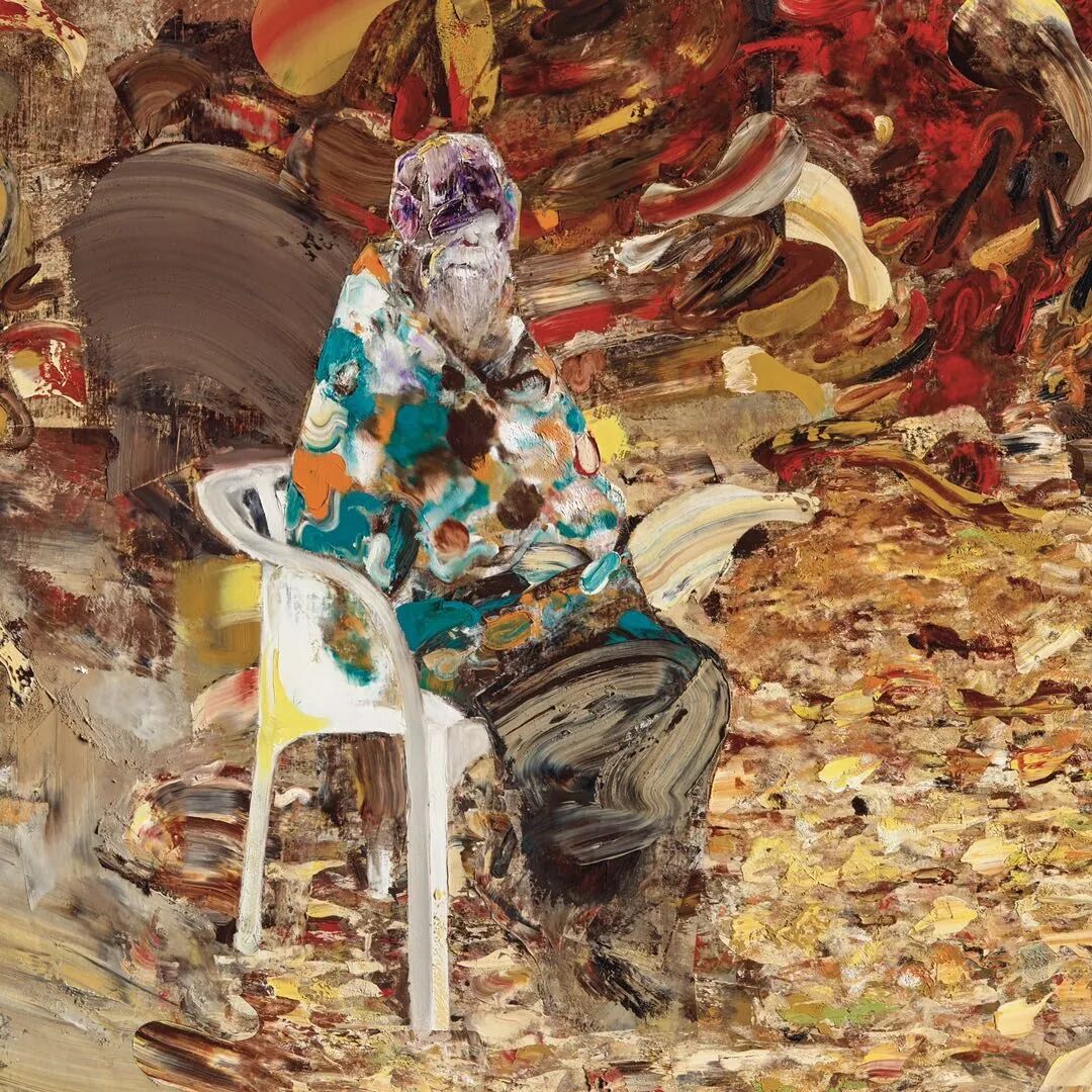 一个孤独的个体静坐在画面中央,周围环绕着无边无尽的自然宇宙:黄金和土色的色块如碎金般围绕着他斑驳闪烁,充斥了整个画幅,让观者仿佛沉醉于一场生命与回忆的梦境之中。