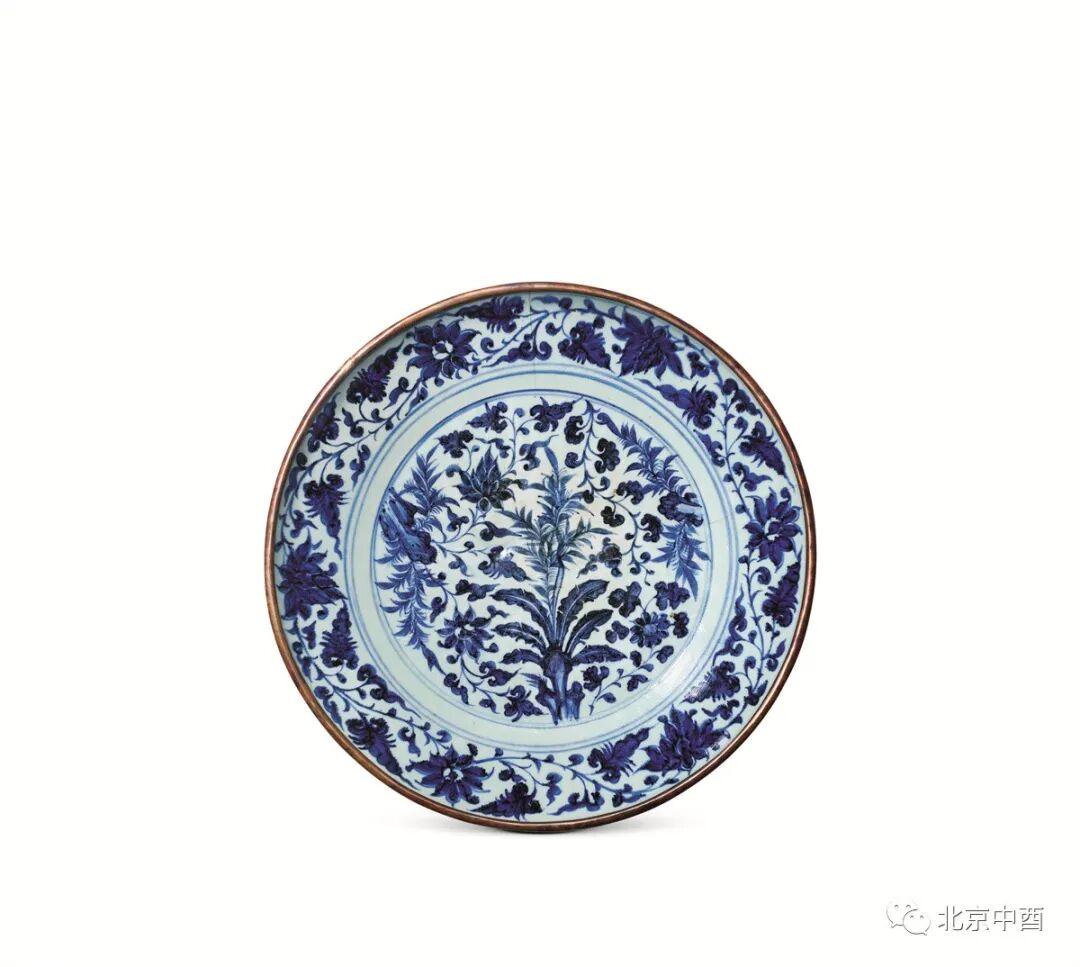 拍品为元代青花瓷器的经典造型之一,端庄周正,尺幅恢宏,颇见气势。敞口,弧腹,圈足,砂底。口沿一周镶铜扣,通体以青花为饰,内地饰缠枝蕉叶莲纹,直冲盘心,左右对称饰有竹石蕉叶莲纹,分向两边延伸。内外壁饰缠枝莲纹。整体青花发色浓淡有致,浓郁处泛出黑斑,系以进口苏料绘就,布局繁缛有序,笔意酣畅。风格粗扩雄放,酒脱自然,兼备粗扩豪放与严谨和谐的艺术美感。应为当年外销西亚、中东之作,具有很高的艺术水准。参阅国内外收藏机构与拍卖市场,此类拍品价格可谓是居高不下,与此拍品同类型中,内地纹饰竹石芭蕉多是与瓜果组合,而本品内地纹饰却纯是竹石芭蕉莲纹却少见。
