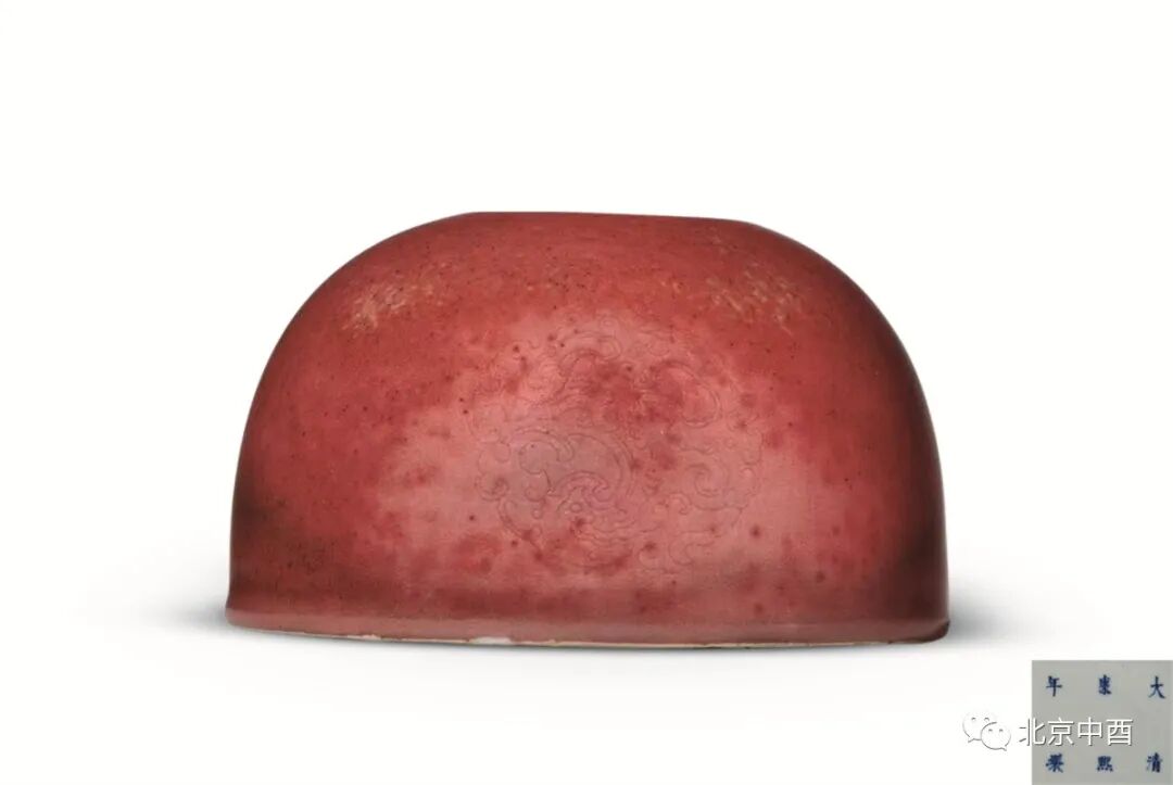 太白尊为康熙朝新创的文房名品,因造型酷似李白饮酒之尊而得名,为文房八大码专属。传世品见有豇豆红釉、白釉品种,其中以豇豆红釉最为著名。豇豆红为康熙红釉中最名贵的品种,由于所施铜红釉敏感易变,烧成难度很大,故只由官窑少量生产,仅供宫廷使用,且无大件器物,其呈色半由天成,经常隐现深浅不同的斑点,正所谓“满身苔点,泛于桃花春浪间”、“莹润无比,居若鲜若黯之间,妙在难以形容也”,拍品釉面泛有点点红斑,偶有片状绿斑,落英缤纷,精美异常。豇豆红釉器流传至今者甚少,其中大部分又在早年流散国外,收藏于各国著名的博物馆中,无论古今中外,皆为传世名品,更显本品之珍。