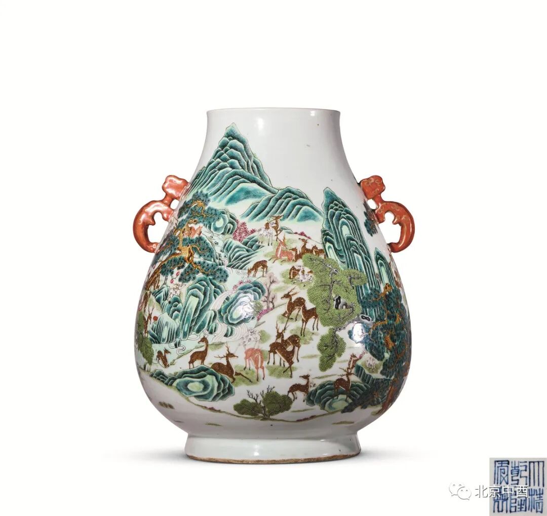 拍品圆口,垂腹,圈足。通体施白釉,肩部饰鹿首耳。胎体厚重,造型端庄。器身绘粉彩山水百鹿图,四周衬以山林、溪流、花草等景物,远山叠嶂,巍峨高渺,山峦起伏,山路蜿蜒而下,树林茂密,韵松如海,溪流回环,苍松翠柏下大小群鹿出没其间。百鹿神态各异,或奔跑、或嬉戏、或觅食、或小憩,一派生机勃勃的景象。画面中山石、树叶多以绿彩绘成,施彩浓厚,群鹿、枝干以赭、黑等彩作画,群鹿活现,枝干苍劲,笔绘生动细腻。如果把尊上的纹饰展开,犹如一幅山水画卷展现眼前,表现了清皇朝重要的狩猎活动“木兰秋弥”。木兰为满语,意为“哨鹿”,秋猕指秋天打猎。这是自康熙二十二年起几乎每年秋天都举办的大典,康熙皇帝为锻炼军队,在承德以北开辟狩猎场,每年秋季狩猎时用八旗兵头戴鹿头,在树林里口学鹿啼叫,引诱异性,鹿出之则合围猎杀。这并非为了狩猎娱乐,而是具有重大的政治、军事意义。拍品因其造型似牛头,又名“牛头尊”。又因器型多绘百鹿图,所以又叫百鹿尊。“鹿”与“禄”谐音,故又称“百禄尊”。禄即俸禄,百禄形容俸禄之高厚,因此百鹿纹是祝颂加官进禄的吉祥图案。鹿为仙禽与苍松翠柏相配也象征着长生不老、松鹤延年之意愿。因此拍品不仅寓意吉祥,也有着重大的政治、军事意义。