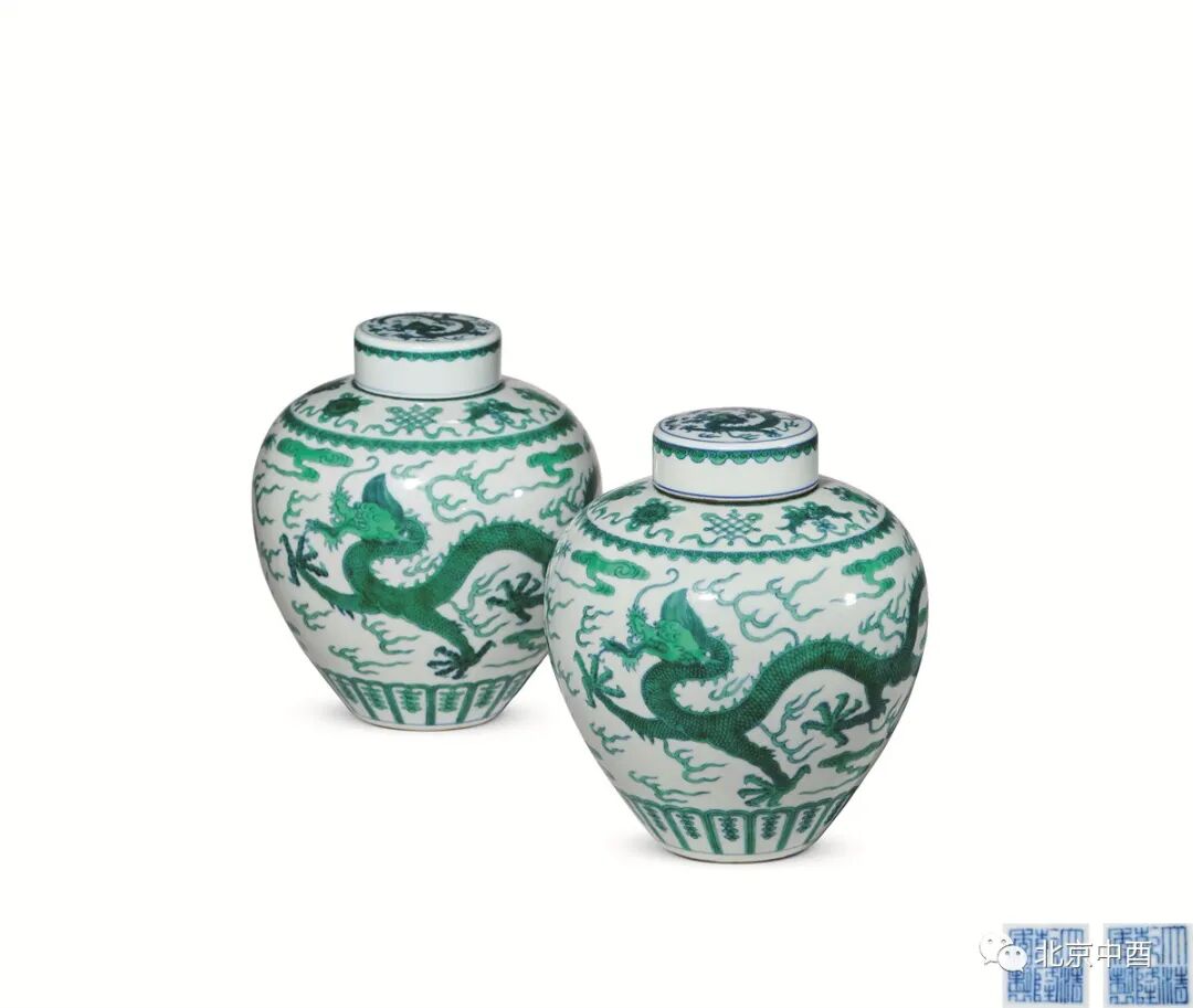Lot 3027清乾隆斗彩绿龙纹盖罐一对