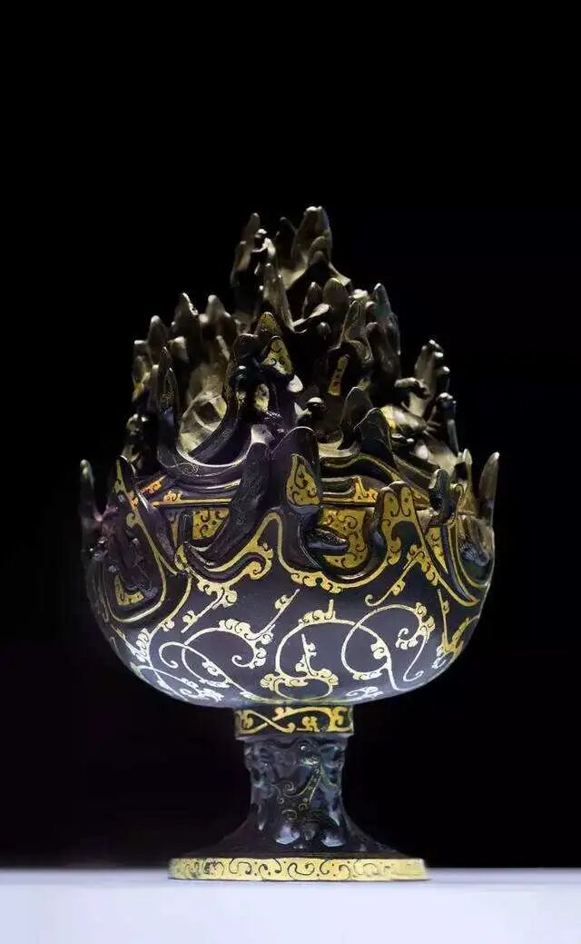 在当时的帝王眼中,这小小的博山炉就是真实可见的“神异世界”,当时的能工巧匠们在方寸之间,为帝王描绘了一个极尽精美的奇妙世界,将小小的香炉修饰成一方神秘的天地。金错云纹缠绕着博山炉,线条层叠而流畅,有意营造了海浪涌动的错觉。在那一片小小的仙境里,可能就是那些帝王梦寐以求的归宿。