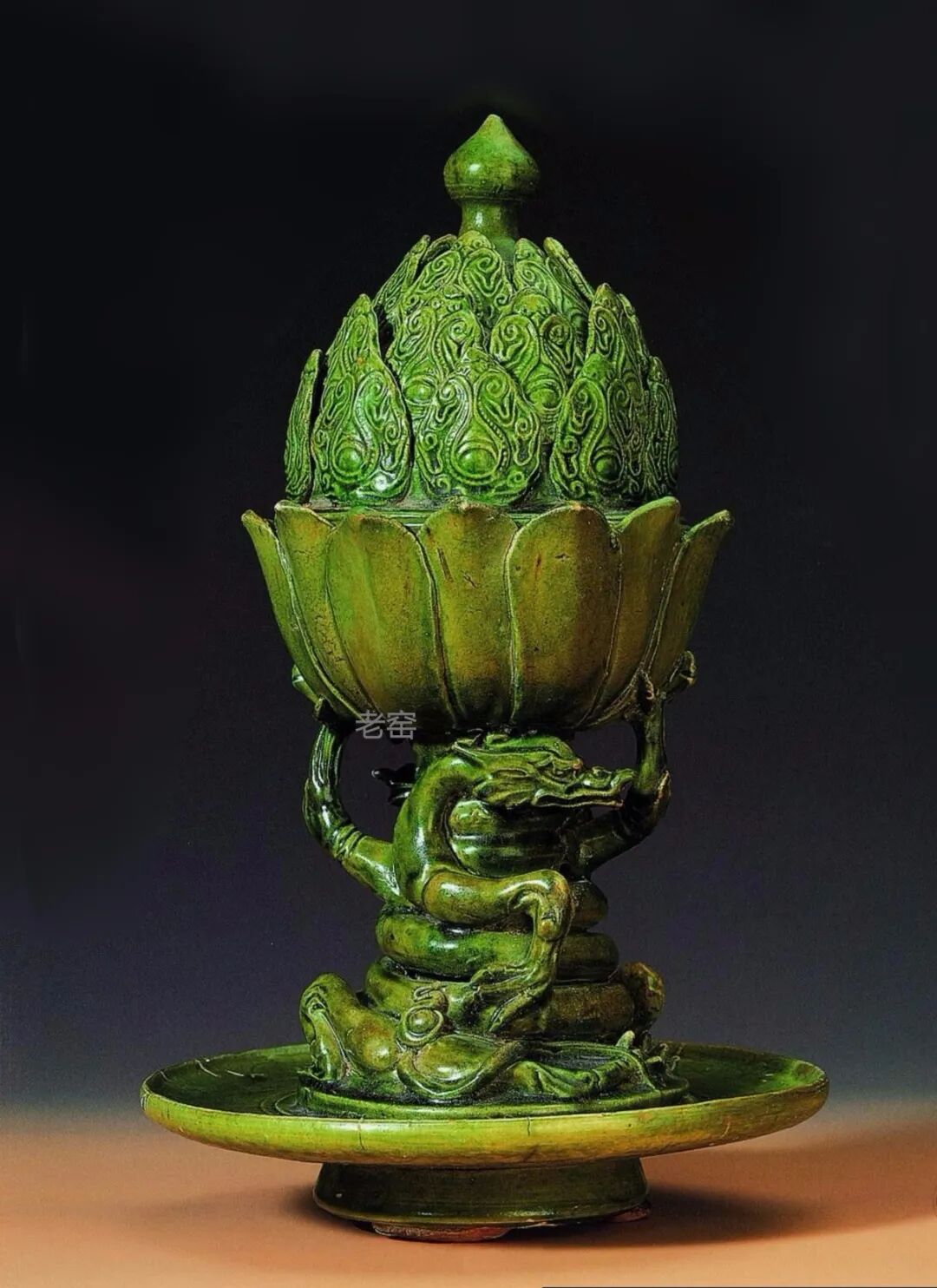 静观堂旧藏隋代巩县窑绿釉莲瓣蟠龙博山炉,1996年香港佳士得秋拍