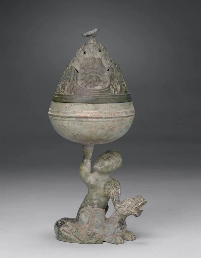 古人一直相信云雾缭绕的深山中居住着神灵,仙人们穿梭云间。列子就说他们住在“岱舆、员峤、方壶、瀛洲、蓬莱”五座仙山里。这些奇思妙想就是汉代博山炉创造和演变的源泉。烟气从熏炉中慢慢飘散出来,环绕着炉身,沐浴在熏香里面的贵族想象自己乘着仙气云游仙境,做着长生不老的美梦。