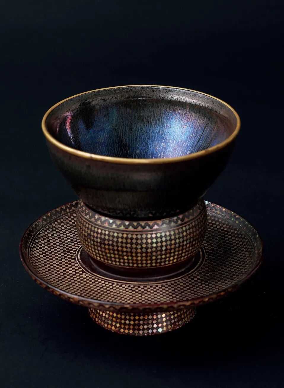 藤田世传蓝兔毫天目茶盏配十四世纪黑漆嵌螺钿盏托