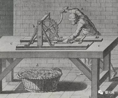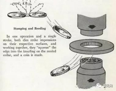 9、早期花边银币的齿边制作:花边银币的冲压是两步骤完成,上边步骤的内齿圈是平滑的,只负责饼胚的定位和限值大小,不负责印制花纹。然后再进行花边滚制: