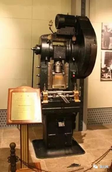 5、制作胚饼:供印制银币用的坯饼由冲床(见下图)完成。标准厚度的条片通过专用冲床上的自动进料轧辊进入冲模,冲下坯饼,展出的冲床每分钟冲180枚。边屑由自动裁切成短片,过秤后退回熔炼处。
