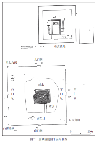 2010~2012年,陕西省考古研究院的“唐陵大遗址考古项目”对献陵遗址开展全面调查、勘探和局部发掘,所发表的简报刊布了此次调查的新资料。献陵遗址由陵园、封土、神道、陵园北建筑基址、下宫遗址、陪葬墓区构成,属于唐代帝陵中四座平地起冢的陵园之一(图二)。