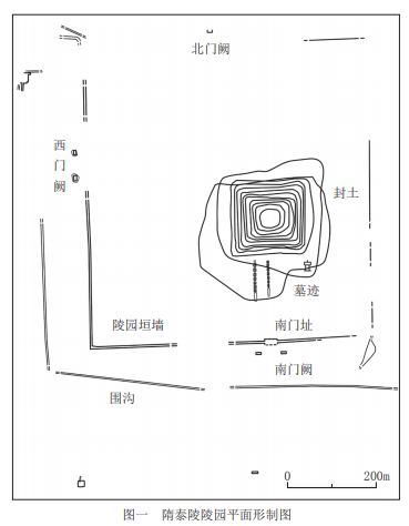 隋文帝泰陵位于陕西省杨凌区五泉乡双庙坡村,是隋代开国皇帝杨坚与独孤皇后的合葬陵。地处渭北台原的南缘,地势较为平坦。1970~1984年文物工作者对泰陵做过多次踏勘工作,大致明确了陵园和“隋文帝祠”的位置和大体范围。2010年,陕西省考古研究院对泰陵陵园遗址做了全面的考古勘探和调查,对其布局有了较为清晰的认识(图一)。