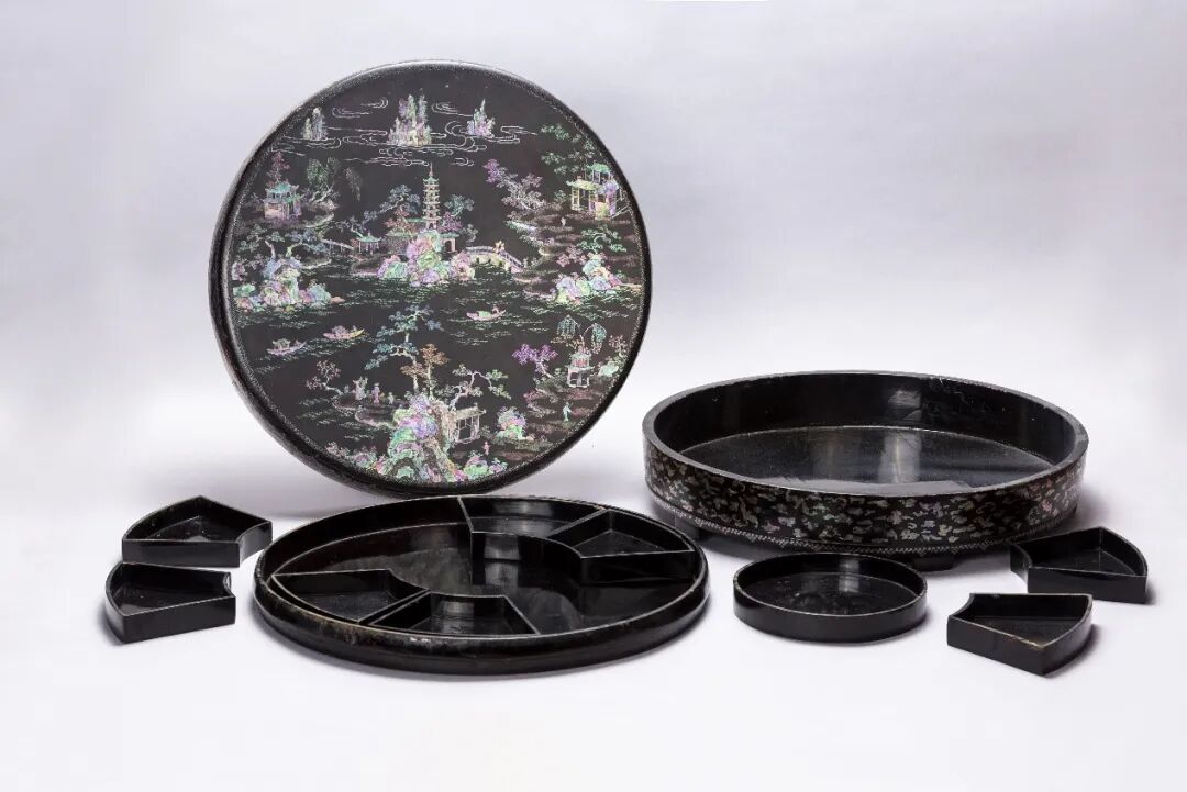 清康熙 黑漆嵌螺钿山水楼阁纹攒盘圆盖盒