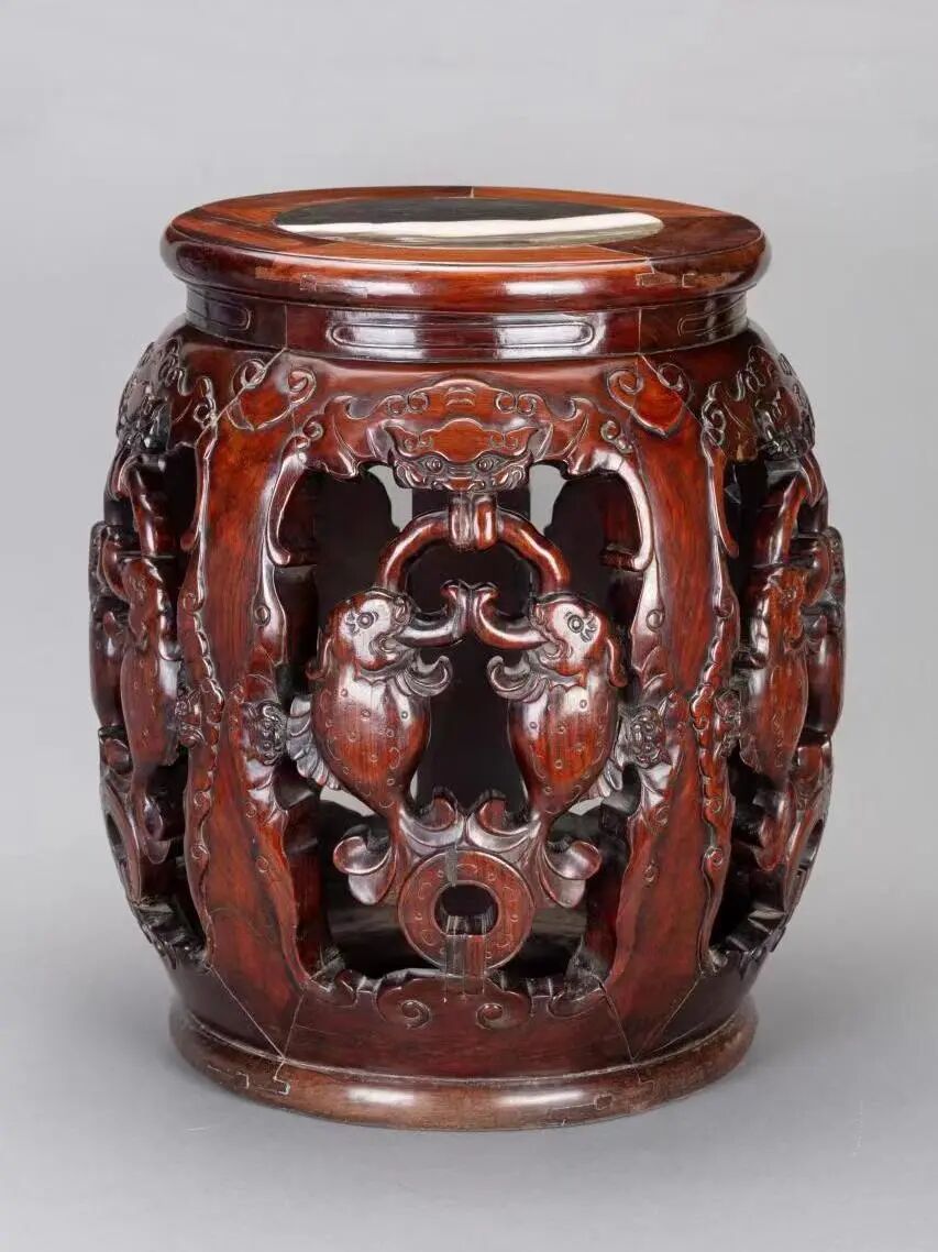 清中期 红木理石面双鱼纹绣墩