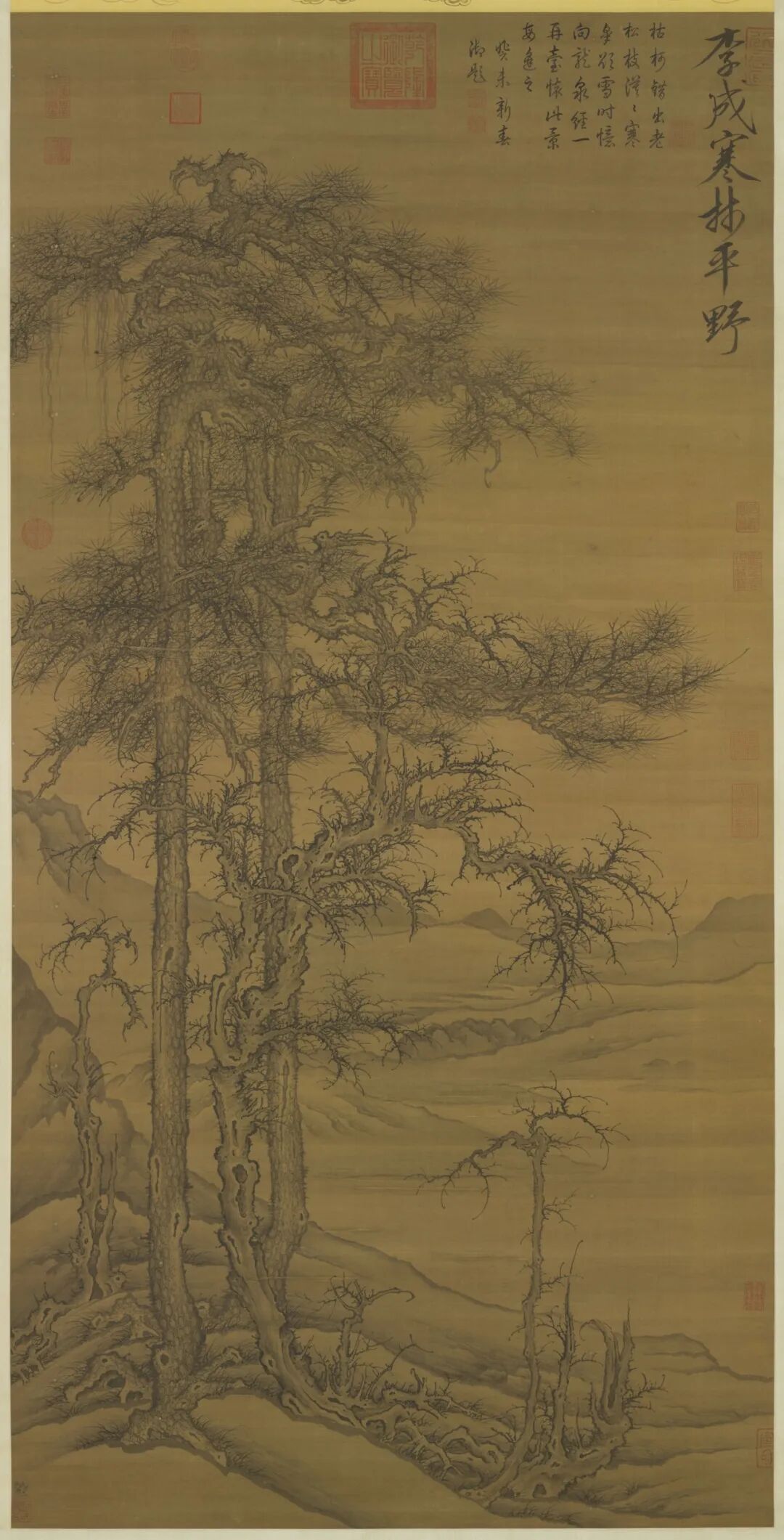 北宋山水画家代表有董源、李成、范宽“北宋三家”,继有王诜、郭熙等名垂画史。以李成为例,传世有《读碑窠石图》、《寒林平野图》、《晴峦萧寺图》、《茂林远岫图》等作。李成字咸熙,文学与绘画并长,醉心书画,山水画对后世影响极为深远,在北宋时期被誉为“古今第一”,尤以画“平远”与“寒林”之景著称画史,笔势锋利,用墨淡润,墨法精微雅淡,气象萧疏,烟林清矿。绘林木时为第一,所画松针“毫锋颍脱”如“攒针”。《图画见闻志》中记载李成:“画松叶谓之攒针,笔不染淡,自有荣枯之色”。米芾描述其《松石图》:“干挺可为隆栋,枝叶凄然生阴”。《寒林平野图》轴中绢本墨笔,近景两株长松亭立,古柏形如苍虬,枝干交柯,老根盘结。松针笔意锐锋,虽不染墨,实有清刚、淡雅之美感,为《笔记中》谓之的“君子之风”。在《读碑窠石图》中,李成绘树木,松树虽不是主体物和画眼,却占据了整幅画面的大部分,画中参天老松虬然挺立,枝干劲瘦如铁,树节用墨点写,树皮斑驳节疤凸显,再施墨皴染,松叶以尖翘的墨线组成,笔灵而坚实。树根如磐石般深扎根于土石之中,墨法浑厚,造型高古。米芾评:“松挺动,枝叶郁然有阴,荆楚小木无冗笔,不作龙蛇鬼神之状。“画中松树有着居万木调零而卓然不群的傲骨与风度。