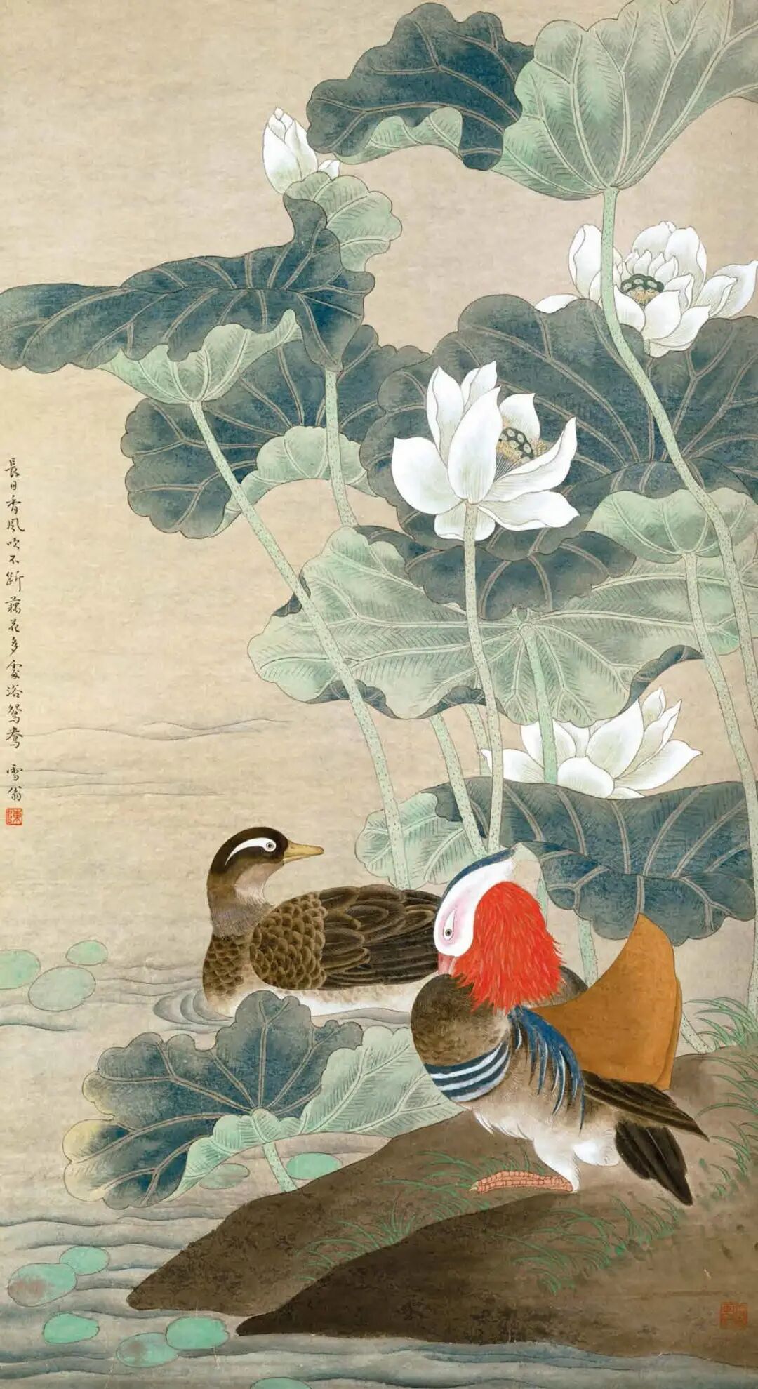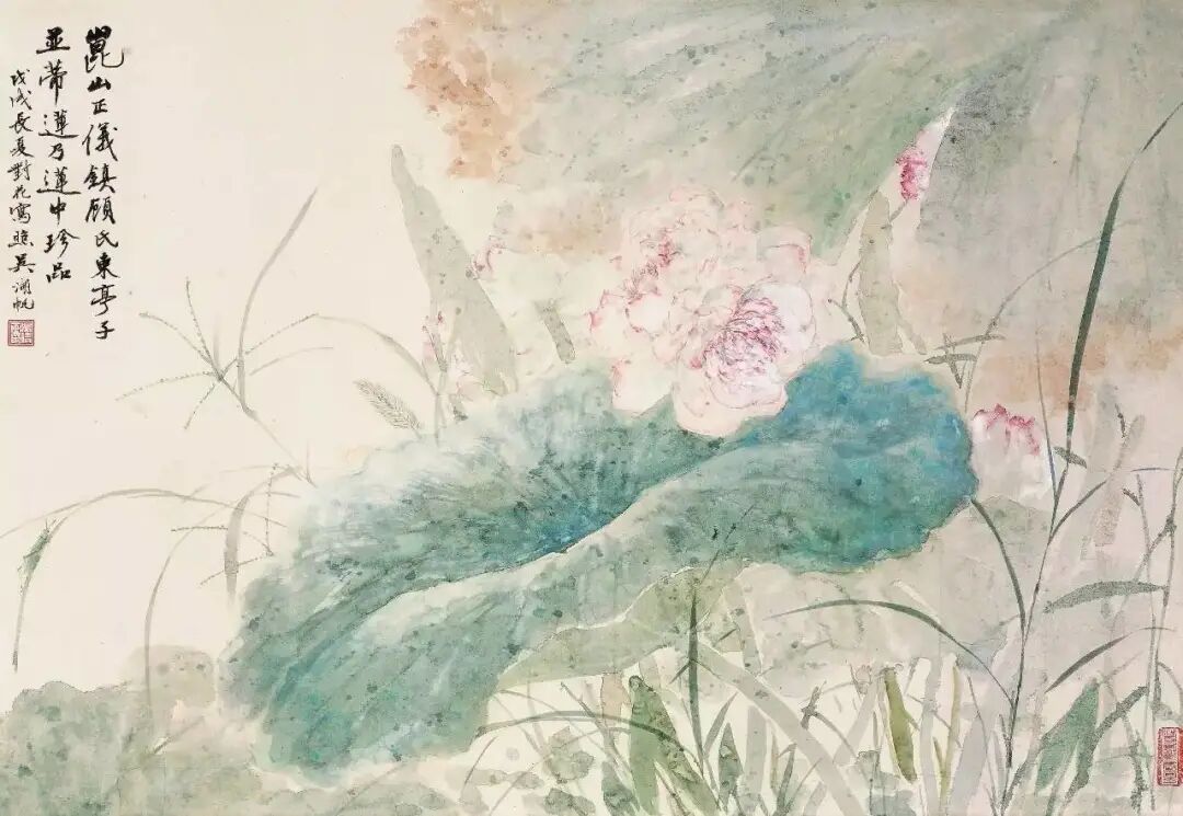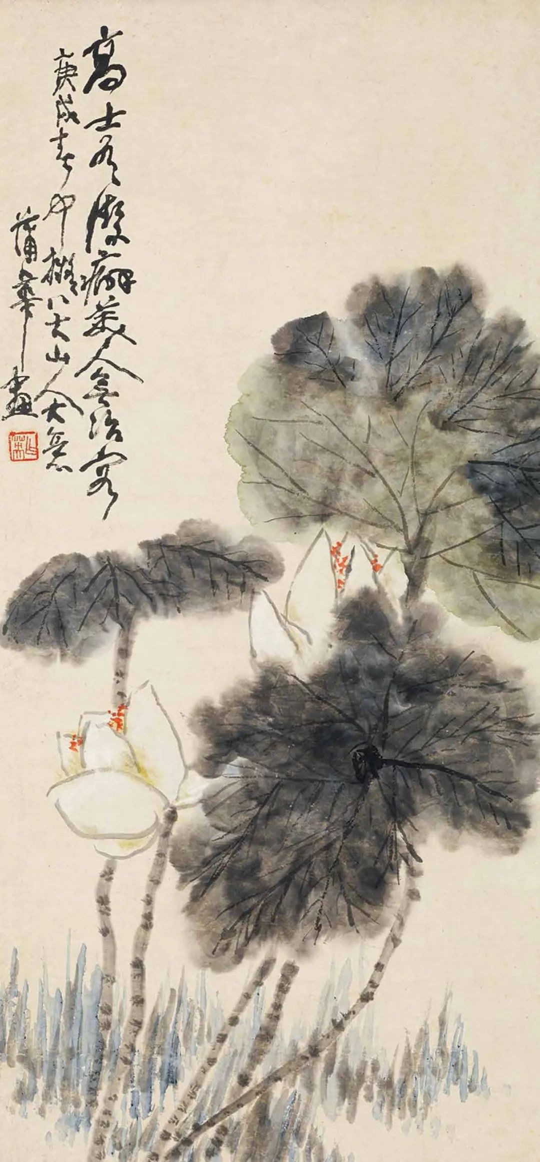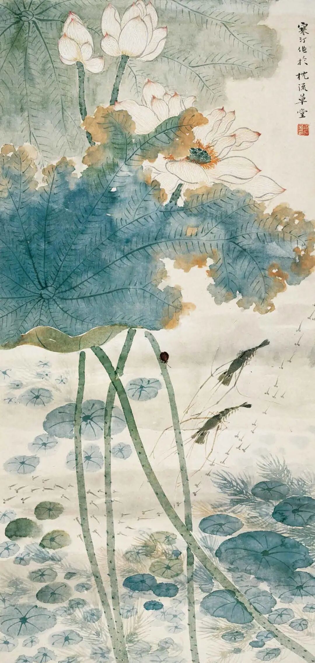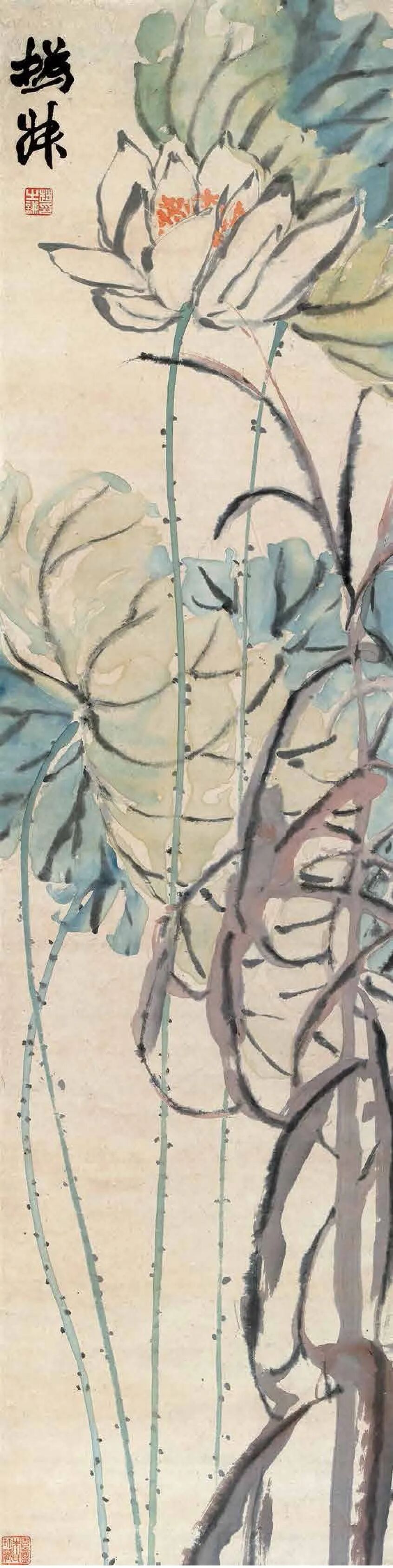 荷花是中国画里最常见的主题之一,海派大家用没骨、泼墨、重彩等方式表现了荷花各式各样的姿态,精彩纷呈。虚谷的“微妙香洁”点出荷花的佛教寓意,吴昌硕的泼墨荷花直追青藤,而陈之佛所绘藕花池中的一对鸳鸯实在令人羡艳……