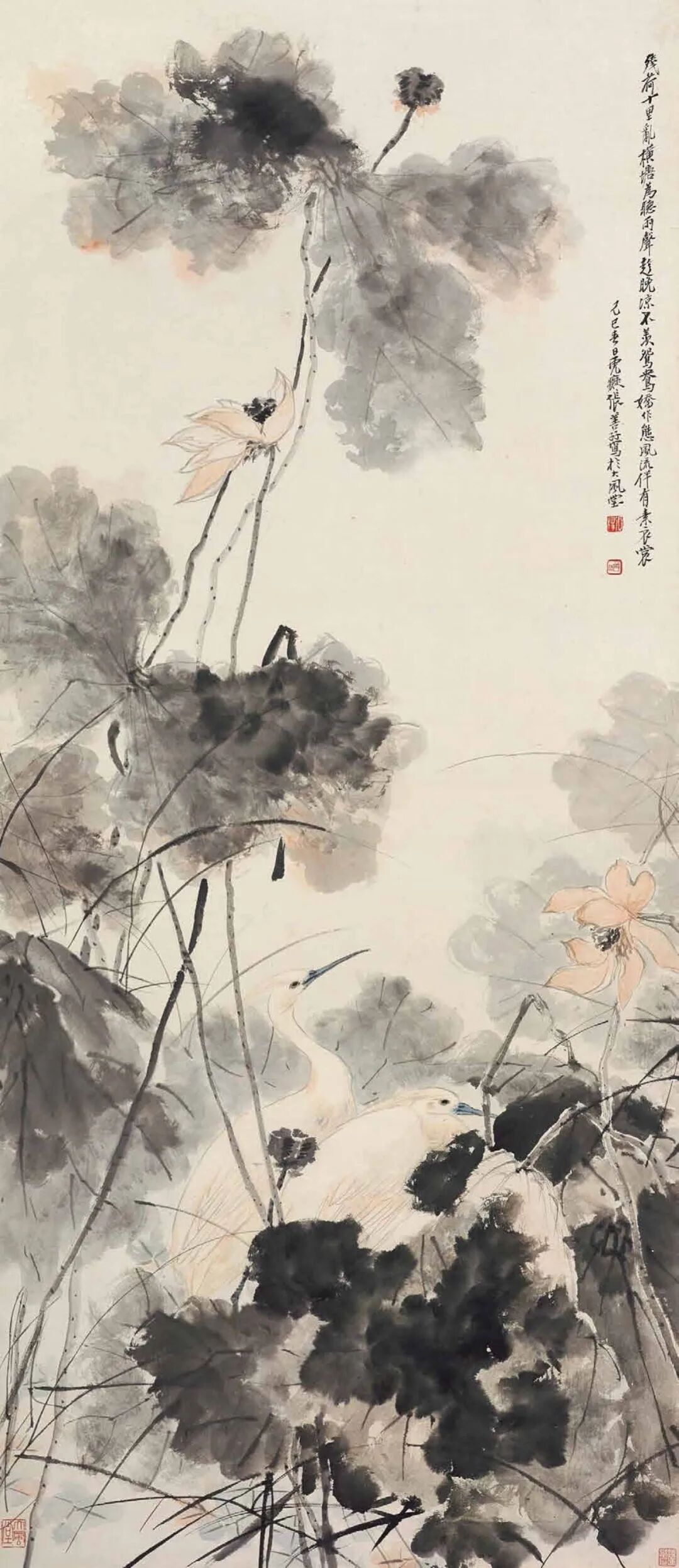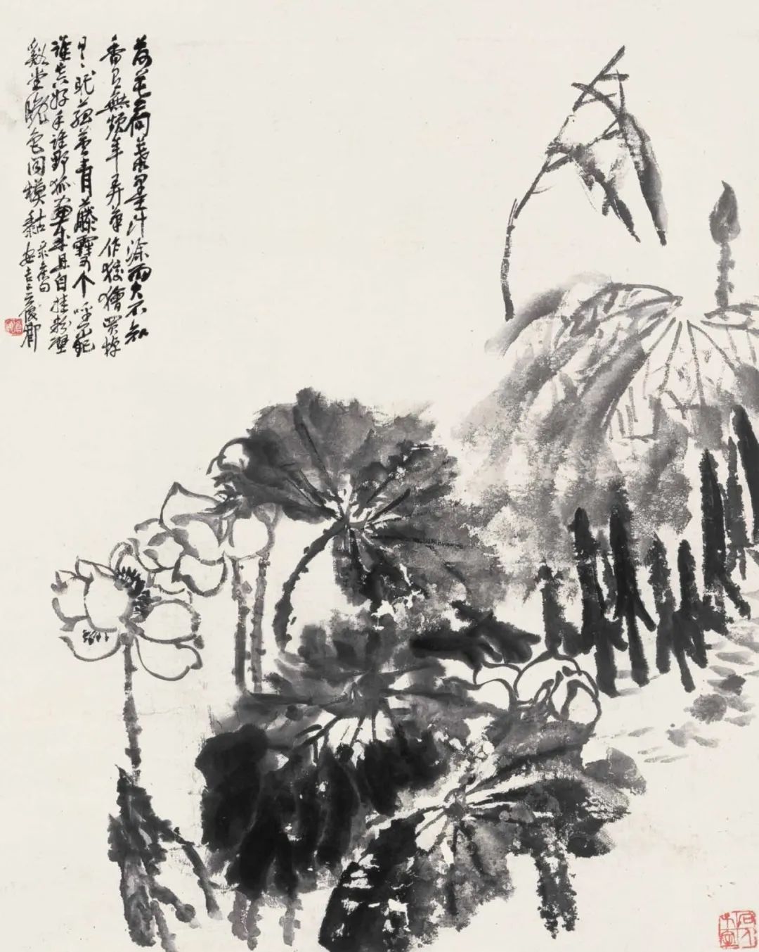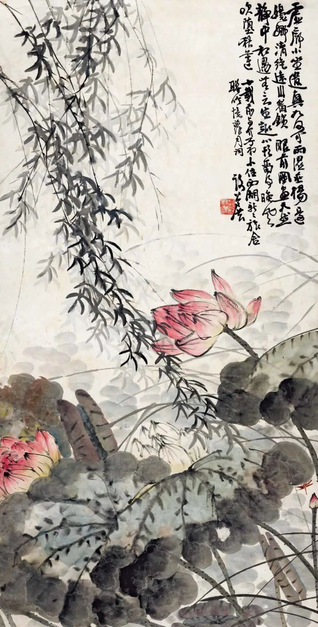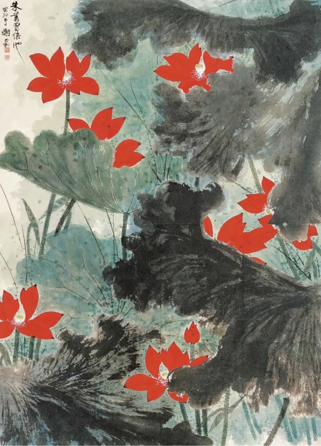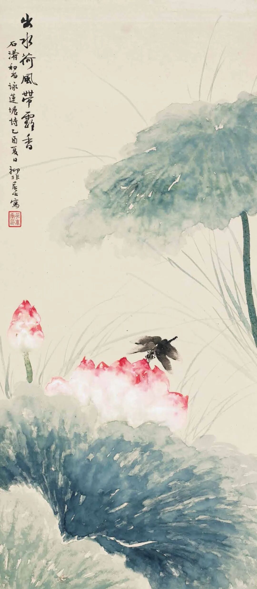 荷花是中国画里最常见的主题之一,海派大家用没骨、泼墨、重彩等方式表现了荷花各式各样的姿态,精彩纷呈。虚谷的“微妙香洁”点出荷花的佛教寓意,吴昌硕的泼墨荷花直追青藤,而陈之佛所绘藕花池中的一对鸳鸯实在令人羡艳……