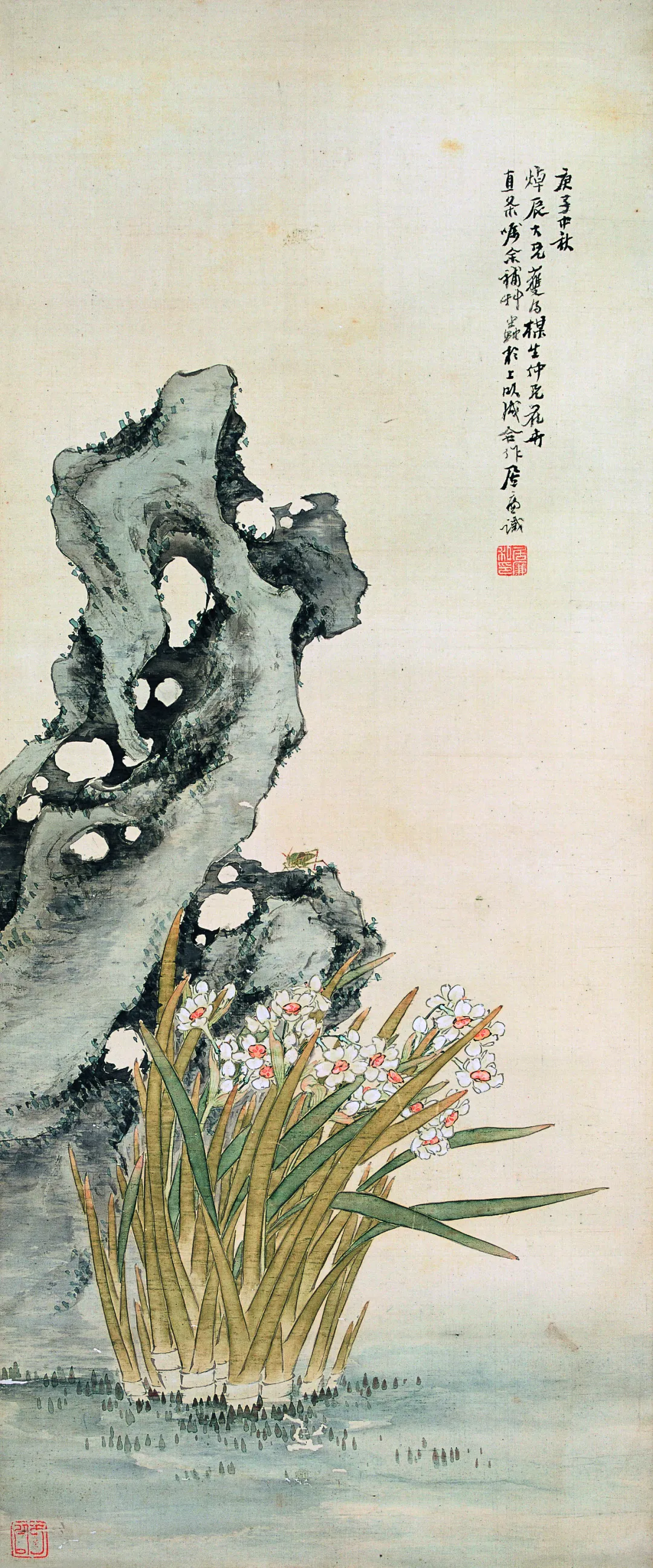 《水仙湖石》居廉补草虫并题 36x86cm19世纪中作 广州艺术博物院藏