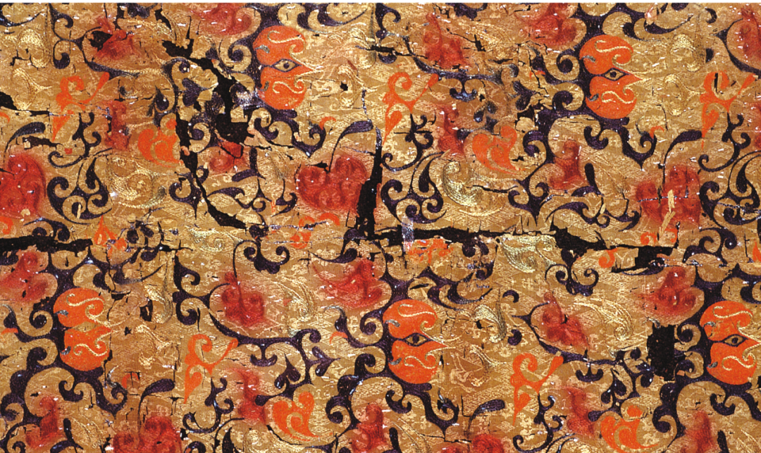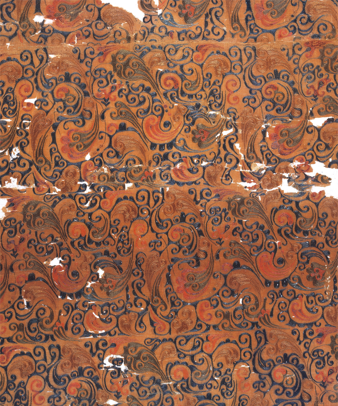 ▲马王堆汉墓出土的黄褐色对鸟菱纹绮地“乘云绣”