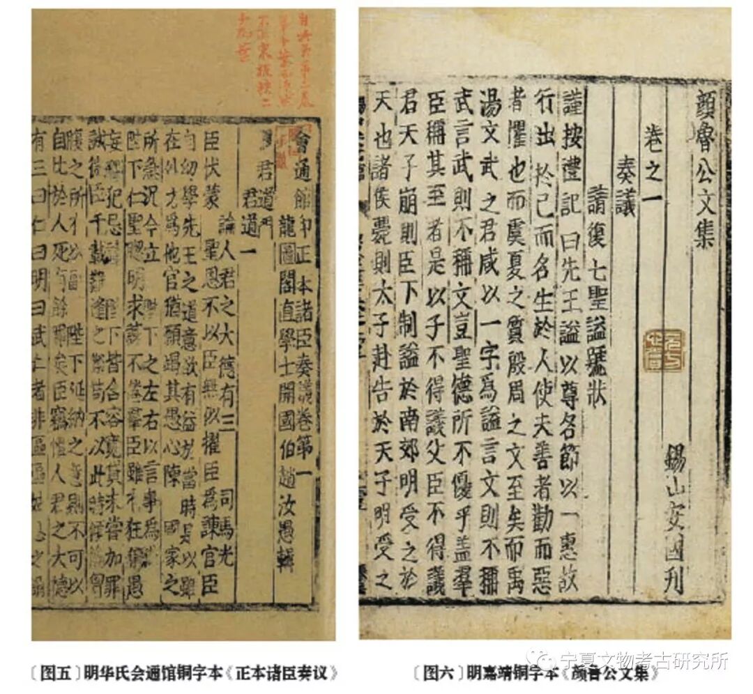 重点谈第一点,张先生谈到,金属活字也有“隔行线的痕迹”。恰如张先生所言,如明代华氏会通馆铜字本《正本诸臣奏议》〔图五〕、明代嘉靖铜字本《颜鲁公文集》〔图六〕等印本,确是字行间也有断断续续的线条。但是“隔行线的痕迹”,与笔者所说的“隔行竹片印痕” 是同一性质的线条吗?显然不是。其实张先生所说的“隔行线的痕迹”就是冀先生所说的“行格界线”。