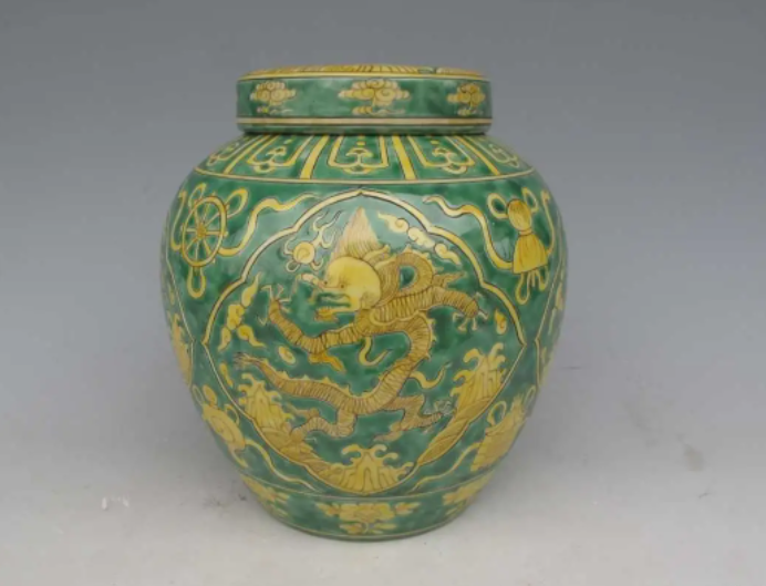 绿地黄彩龙纹盖罐