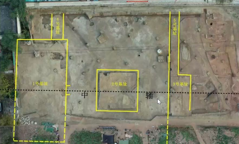 图四 西营村南朝佛寺遗址空间形态,其中推测1号基址为金堂、2号基址为塔基、3号基址为山门、4号5号基址为连廊(图片来源:南京市考古研究院)