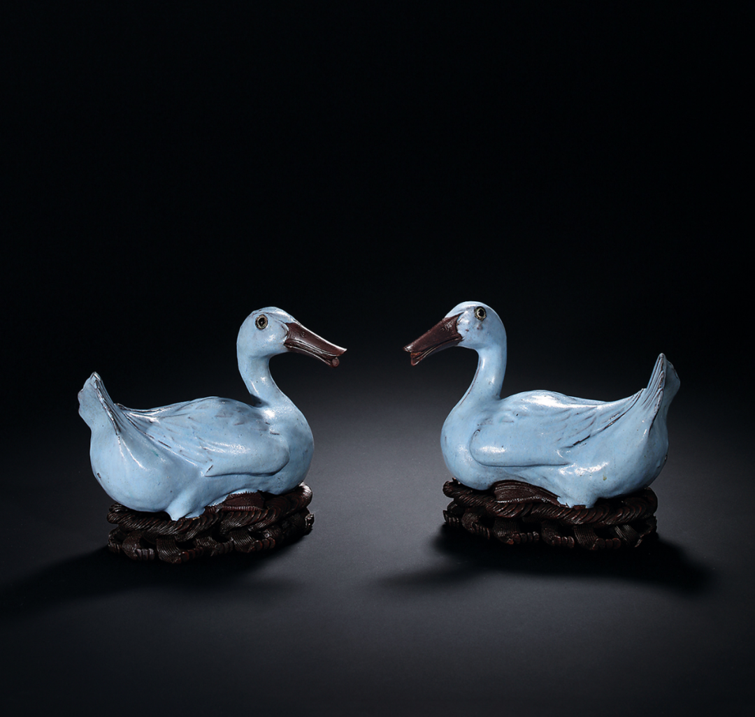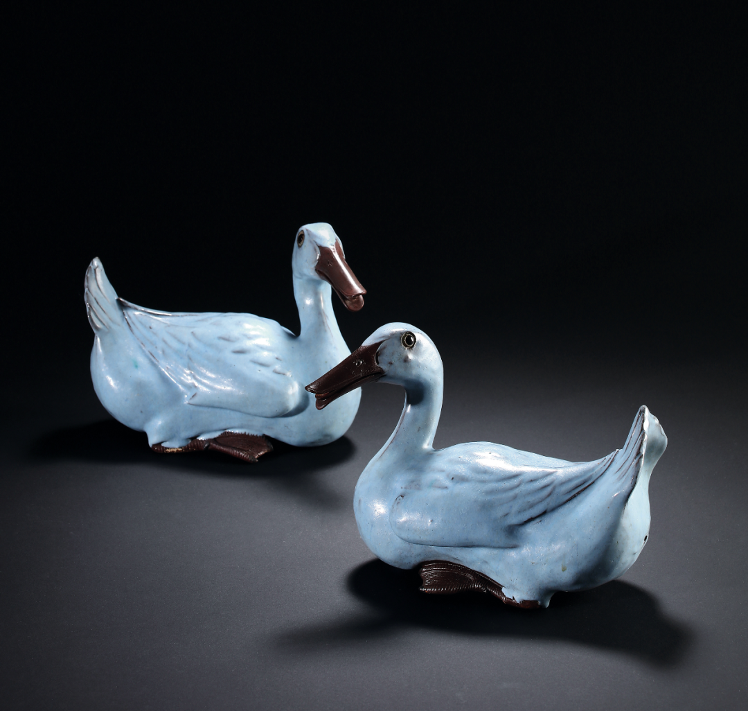 清早期 宜均天蓝釉紫砂胎鸭形摆件 (一对)