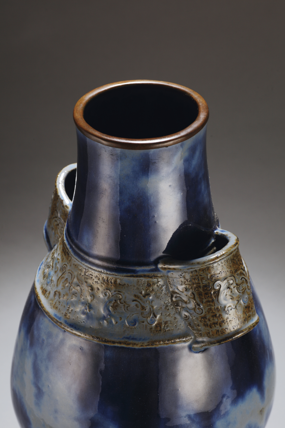 名人谷应泰《博物要览》载:“近年新烧,皆宜兴砂土为胎”,清人朱琰《陶说》又载:”明时江南常州府宜兴欧姓者造瓷器,曰欧窑。”自明以来,此宜钧品种一直延续烧造至清,《清宫内务府造办处活计清档》记载大臣曾进贡多例宜兴挂釉器,可知此类品种亦深受皇家喜爱。